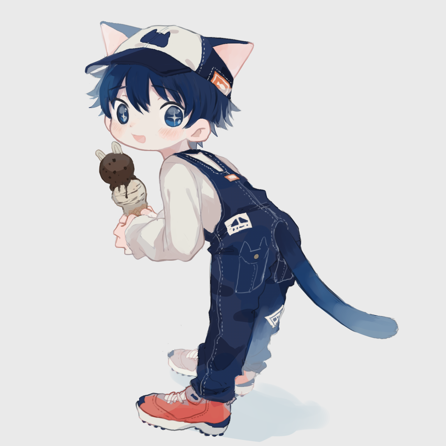 +_+ 1boy animal_ears black_hair black_hat black_overalls blue_eyes blush_stickers cat_boy cat_ears cat_tail clothing_cutout commentary_request cotono_(nazekun) ears_through_headwear food grey_background grey_shirt hat highres holding holding_ice_cream_cone ice_cream ice_cream_cone leaning_forward long_sleeves looking_at_viewer looking_back male_focus neko-kun_(cotono_(nazekun)) open_mouth original overalls red_shoes shirt shoes short_hair simple_background smile sneakers tail tail_through_clothes