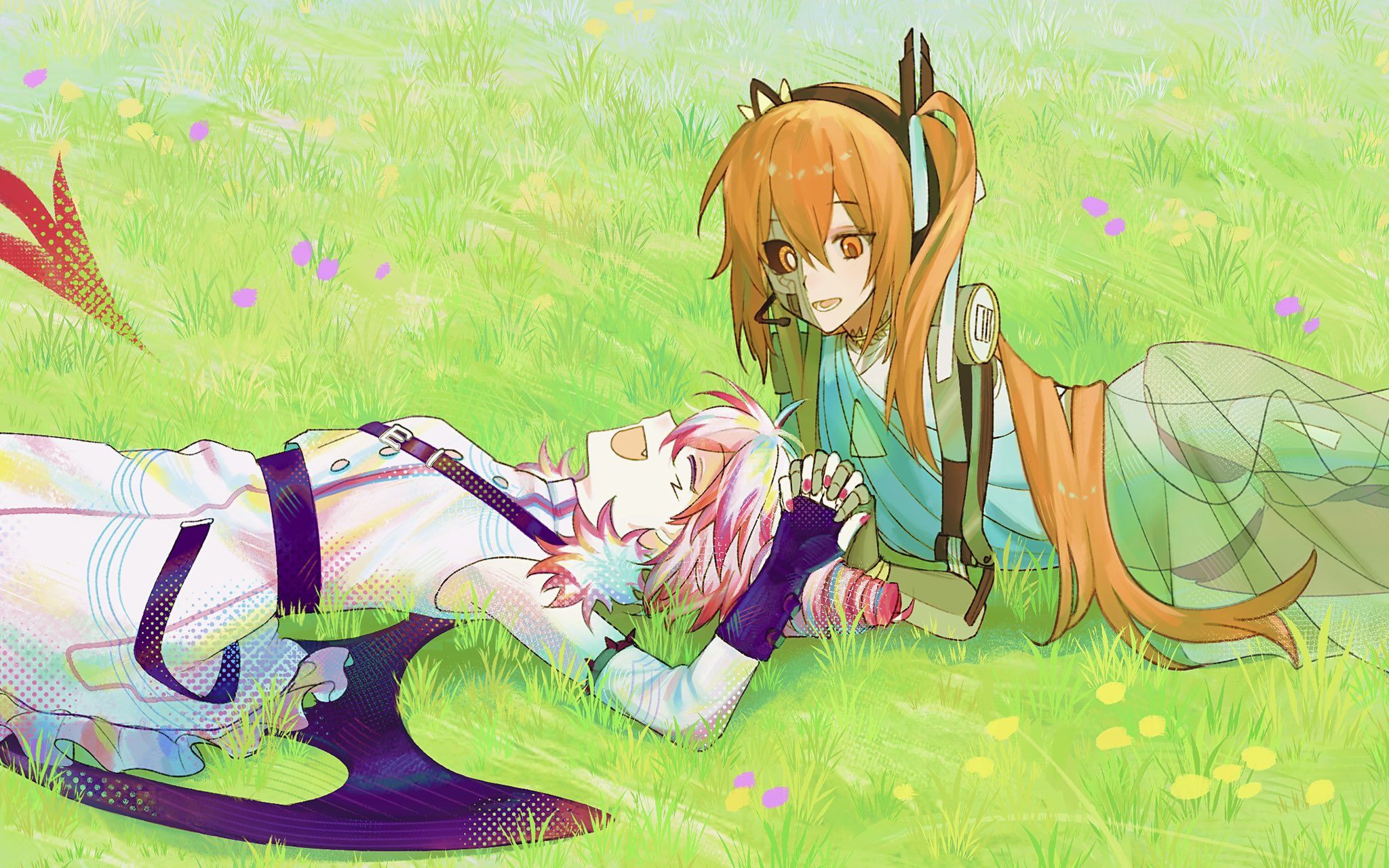2girls a.i._voice adachi_rei adapted_costume alternate_costume android belt black_belt blue_dress bright_pupils commentary dress drill_hair elbow_gloves english_commentary field fingerless_gloves gloves grey_jacket grey_shirt hair_ribbon headlamp highres holding_hands interlocked_fingers jacket kasane_teto kasane_teto_(sv) lying machina_mori_(utau) machine_love_(synthesizer_v) multiple_girls on_back on_side orange_eyes orange_hair radio_antenna ribbon shirt shoulder_belt side_drill side_ponytail skirt skirt_set sleeveless sleeveless_shirt striped_clothes striped_jacket striped_skirt utau white_pupils white_ribbon xom0meku