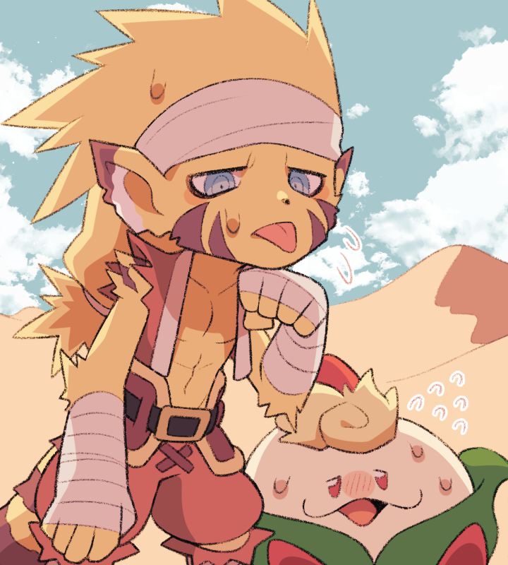 animal_ears bandaged_arm bandages belt blonde_hair blue_eyes breath_of_fire breath_of_fire_iii cloud facial_mark headband long_hair looking_at_viewer male_focus minashirazu multiple_boys open_mouth peco_(breath_of_fire) rei_(breath_of_fire) ringed_eyes sand sweat tail tongue tongue_out