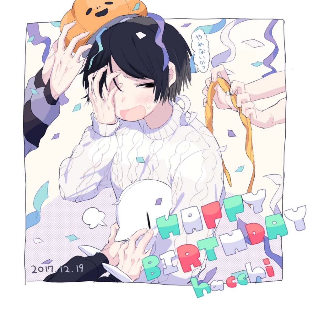 4boys black_eyes black_hair blush cable_knit character_name commentary_request cotono_(nazekun) dated hacchi_(napoli_no_otokotachi) happy_birthday jack-o'_ran-tan long_sleeves male_focus multiple_boys napoli_no_otokotachi open_mouth out_of_frame pumpkin_hat short_hair shu3_(napoli_no_otokotachi) solo_focus sugiru_(napoli_no_otokotachi) sweat sweater upper_body white_sweater