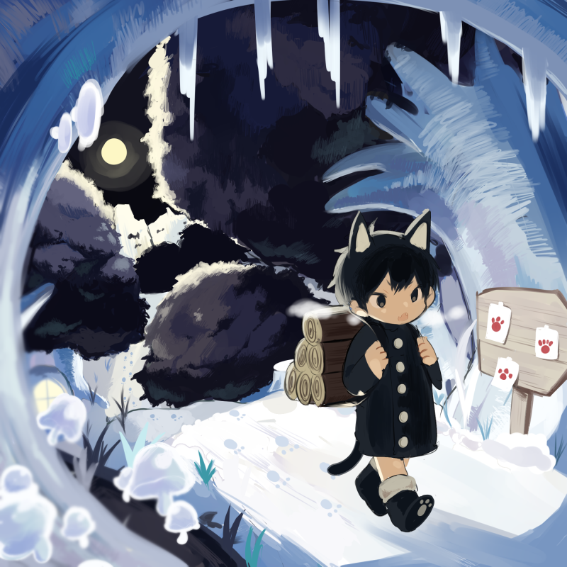 1boy animal_ears black_boots black_coat black_eyes black_hair black_sky boots cat_boy cat_ears cat_tail cave coat commentary_request cotono_(nazekun) fang fangs full_body full_moon icicle log male_focus moon neko-kun_(cotono_(nazekun)) night open_mouth original outdoors paw_print short_hair sign skin_fang sky snow solo tail v-shaped_eyebrows walking winter