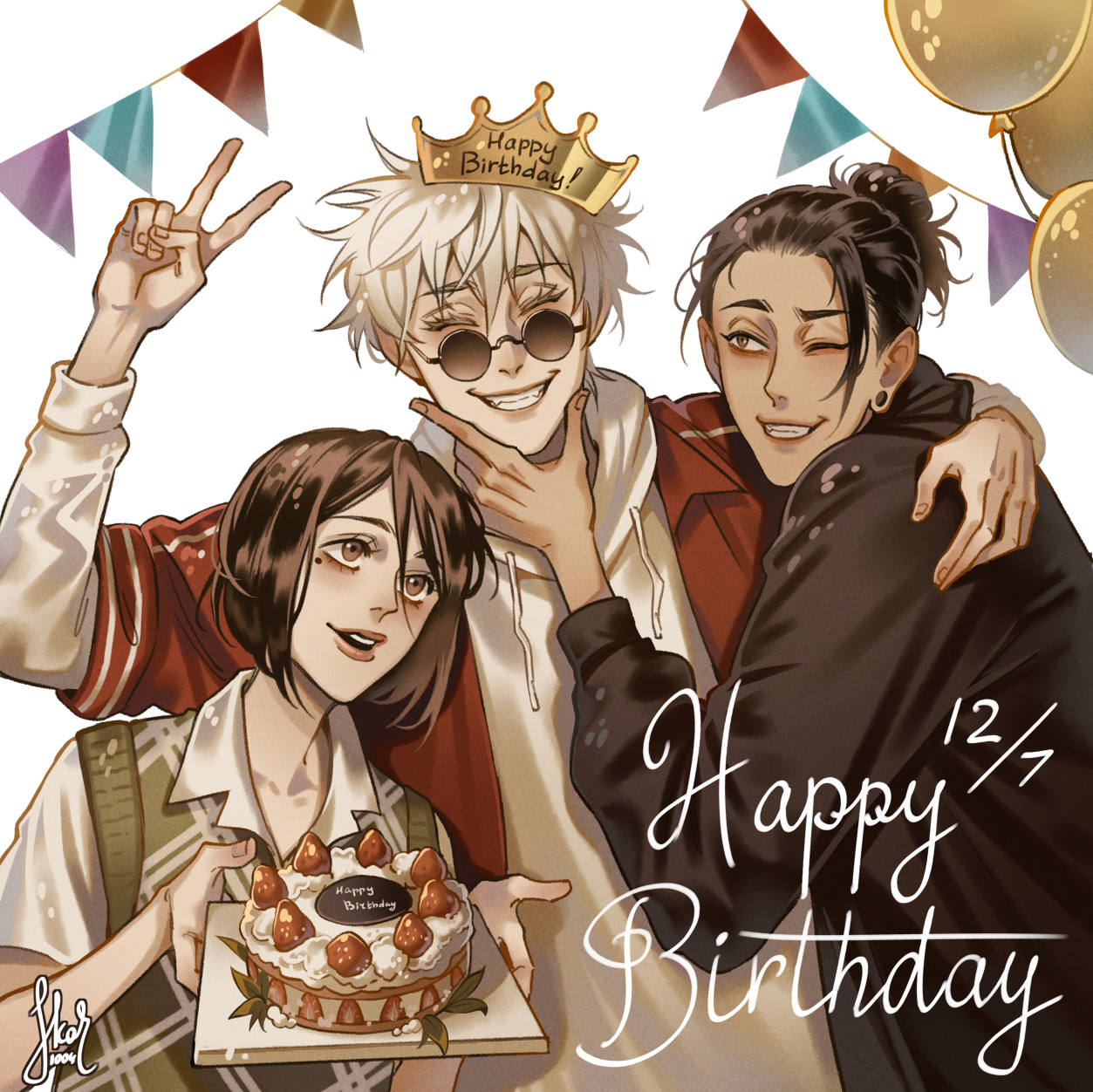 1girl 2boys ^_^ balloon birthday_cake black_hair bob_cut brown_eyes brown_hair cake closed_eyes crown earrings food geto_suguru gojo_satoru happy_birthday hashtag-only_commentary highres hood hoodie ieiri_shoko jewelry jujutsu_kaisen mole mole_under_eye multiple_boys one_eye_closed round_eyewear single_sidelock skar_1004 smile strawberry_shortcake swept_bangs upper_body v white_hair white_hoodie
