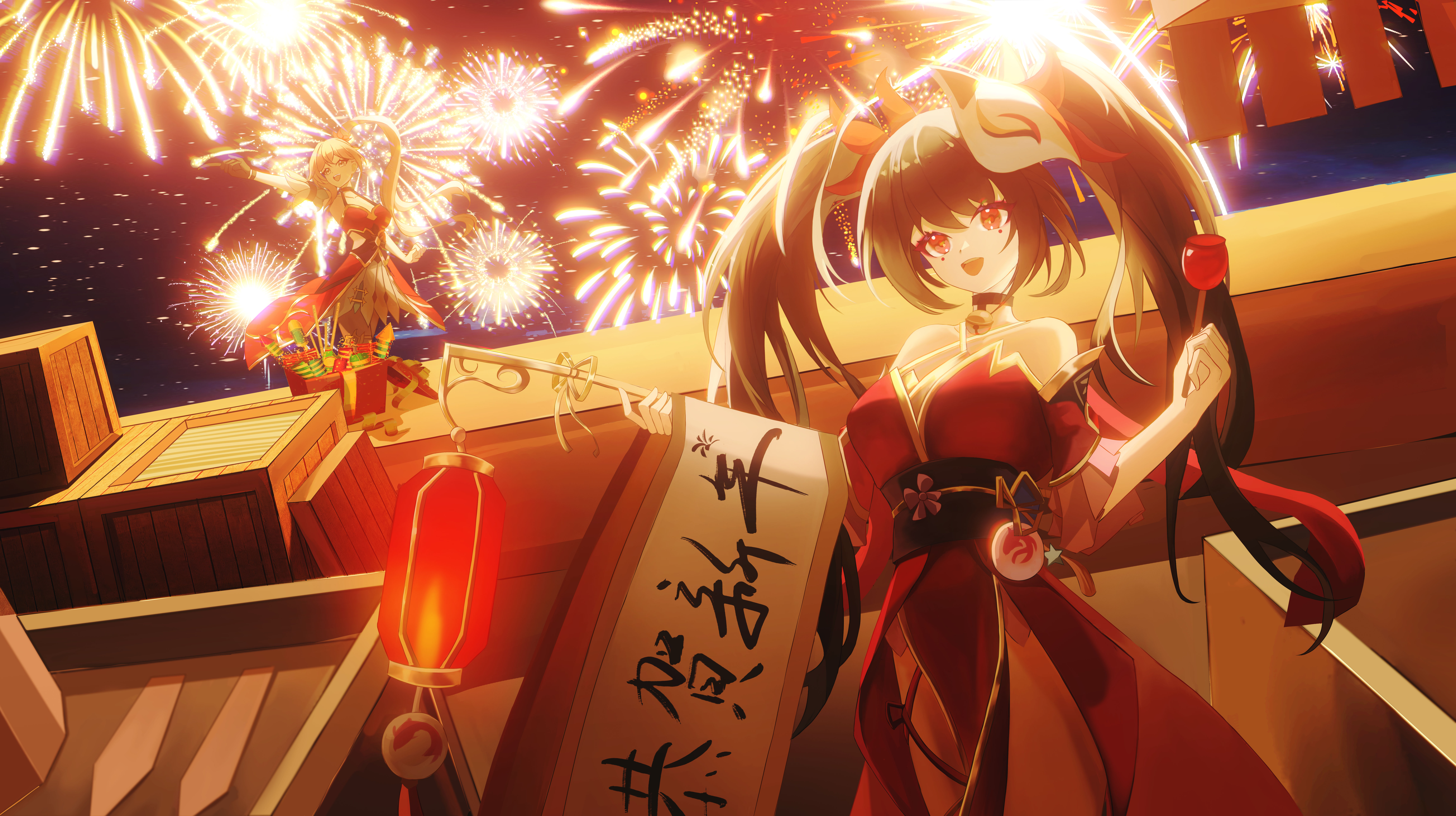 2girls absurdres black_hair candy_apple cowboy_shot crate dress fireworks guinaifen_(honkai:_star_rail) highres holding holding_candy_apple holding_food holding_lantern honkai:_star_rail honkai_(series) ktl_suda lantern looking_at_viewer mask multiple_girls new_year night red_dress red_eyes smile solo_focus sparkle_(honkai:_star_rail) thighs twintails