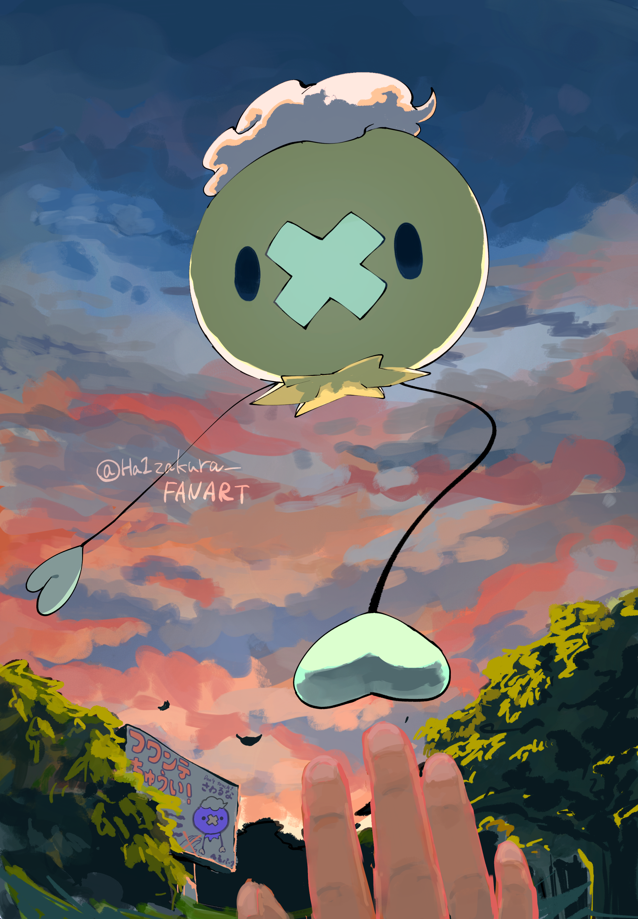 absurdres alternate_color animal_focus artist_name backlighting balloon black_eyes cloud cloudy_sky commentary_request drifloon gen_4_pokemon ha1zakura highres impending_doom leaf looking_at_viewer nintendo outdoors pokemon pokemon_(creature) pov pov_hands reaching shiny_pokemon sign sky solo_focus straight-on tree warning_sign