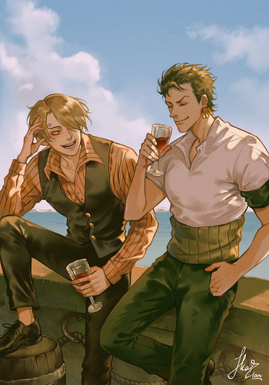 2boys black_pants black_shoes black_vest blue_sky closed_eyes cup curly_eyebrows earrings green_hair hair_over_one_eye haramaki highres holding holding_cup jewelry looking_at_another male_focus multiple_boys one_piece orange_shirt pants roronoa_zoro sanji_(one_piece) shirt shoes short_hair signature skar_1004 sky smile striped_clothes striped_shirt v-shaped_eyebrows vertical-striped_clothes vertical-striped_shirt vest