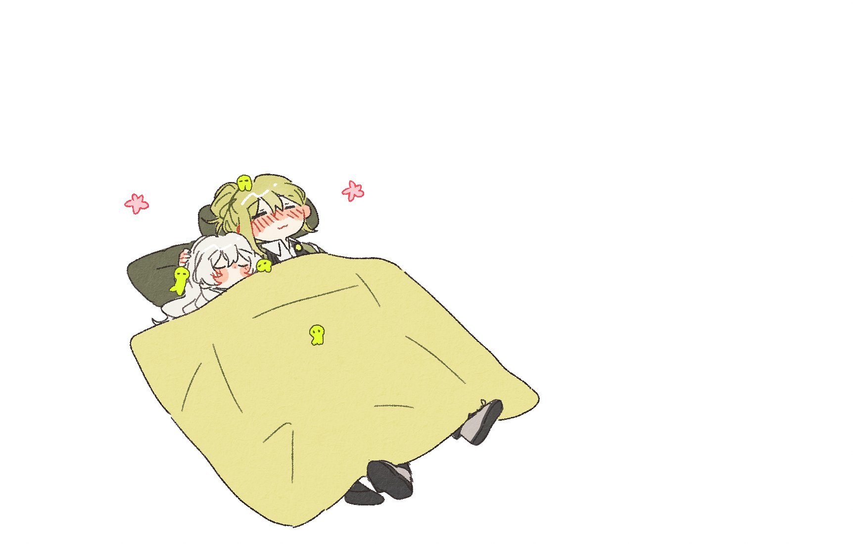 1boy 1girl :3 blush closed_eyes floor_of_art's_glowing_creature hair_bun headpat hetero highres keicorporationz library_of_ruina lying netzach_(project_moon) nugget_(project_moon) oc_x_canon on_back pillow project_moon single_hair_bun sleeping sleeping_together under_covers white_background white_hair