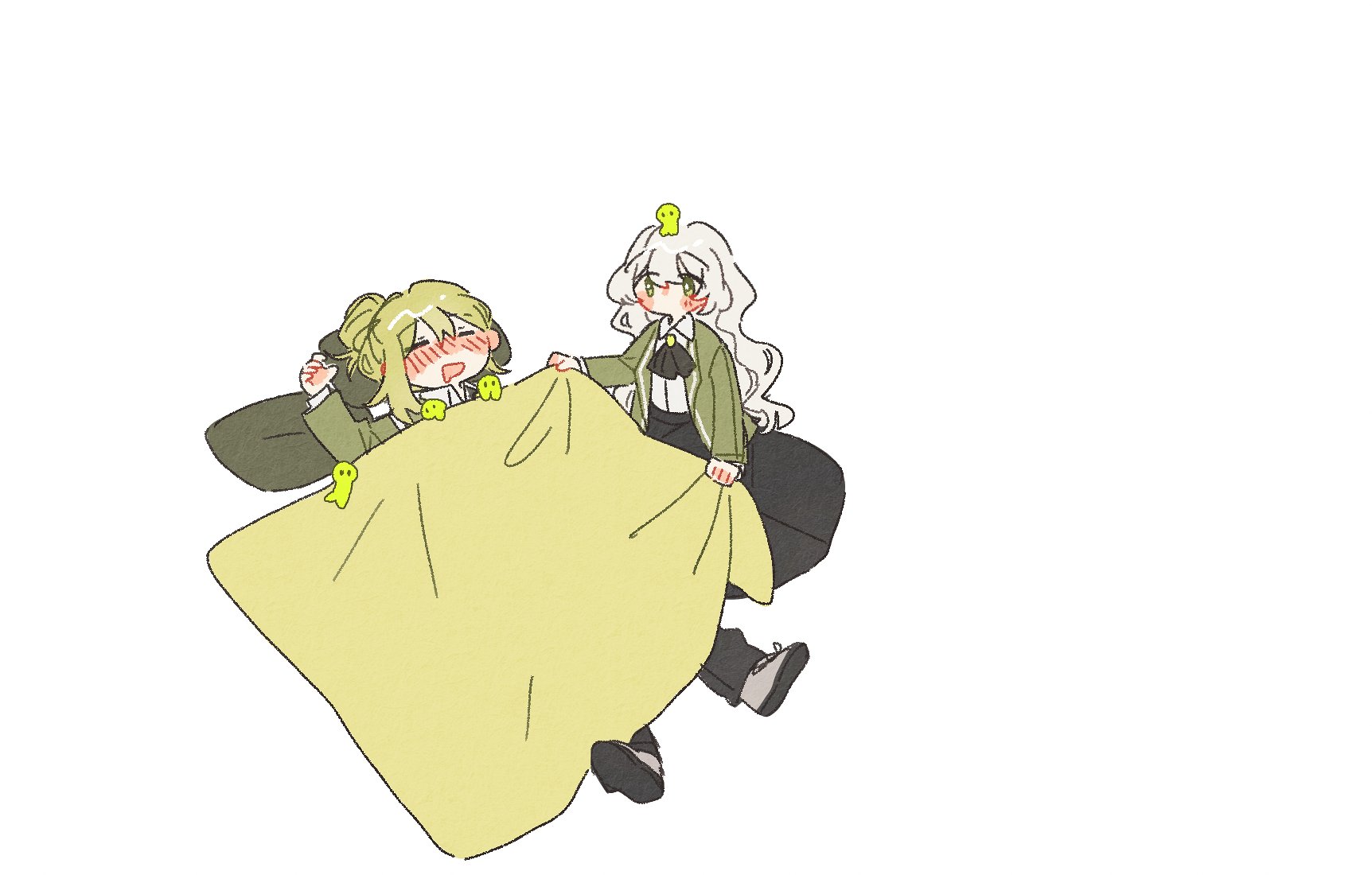 1boy 1girl black_pants black_skirt blanket closed_eyes collared_shirt creature_on_head dress_shirt drooling floor_of_art's_glowing_creature green_hair green_jacket hair_bun highres jacket keicorporationz library_of_ruina long_hair lying mouth_drool netzach_(project_moon) nugget_(project_moon) oc_x_canon original pants pillow project_moon shirt single_hair_bun sitting skirt sleeping under_covers white_background white_hair white_shirt