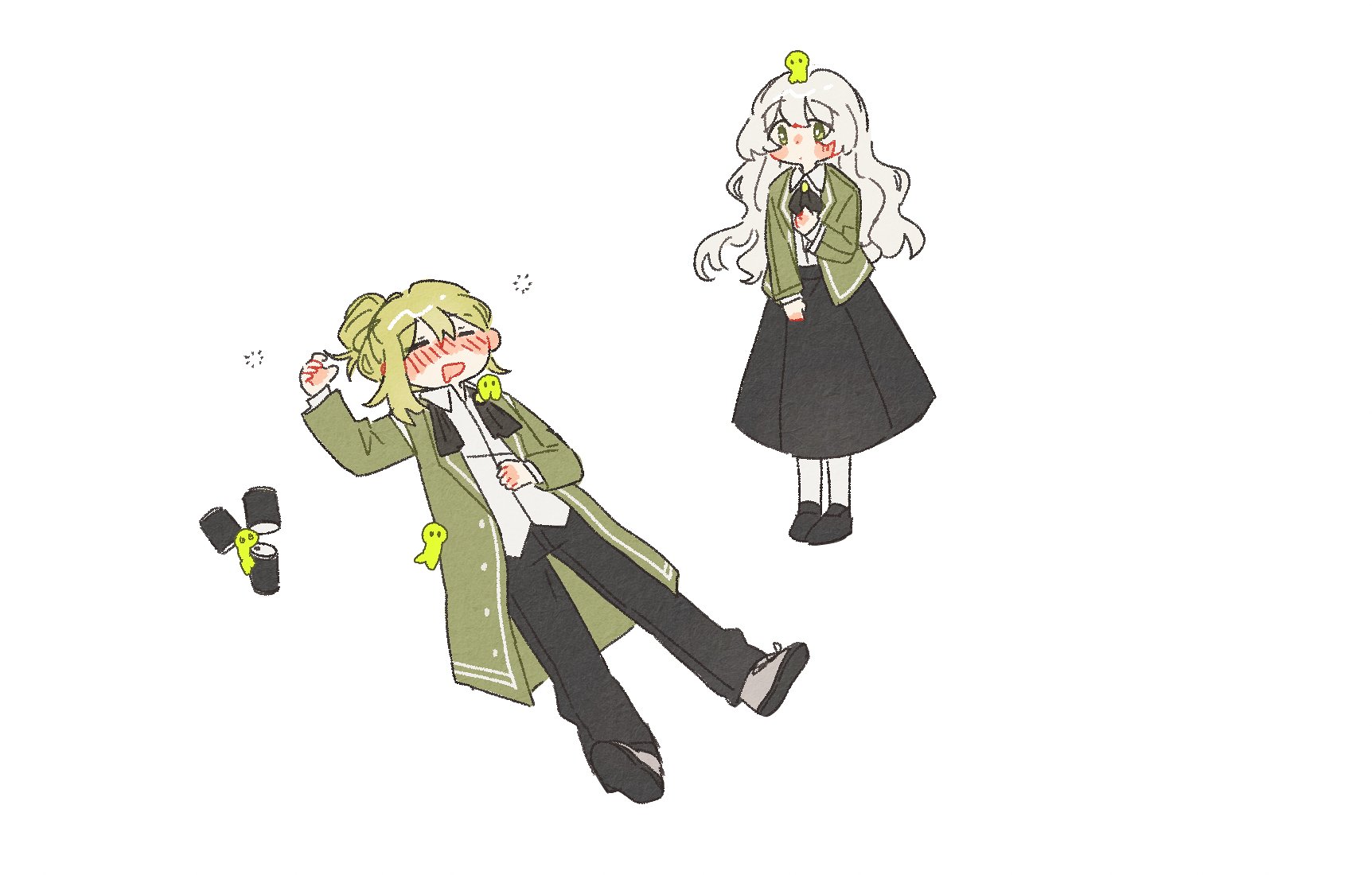 1boy 1girl ascot black_ascot black_shoes black_skirt blush can closed_eyes coat collared_shirt dress_shirt drooling drunk floor_of_art's_glowing_creature full_body green_coat green_eyes green_hair green_jacket grey_shoes hair_bun hand_on_own_stomach highres jacket keicorporationz lapels library_of_ruina long_hair long_skirt looking_at_another lying mouth_drool netzach_(project_moon) nugget_(project_moon) oc_x_canon on_back original project_moon shirt shirt_tucked_in shoes simple_background single_hair_bun skirt squeans standing unconscious unconscious_male undone_ascot untucked_shirt white_background white_hair white_shirt