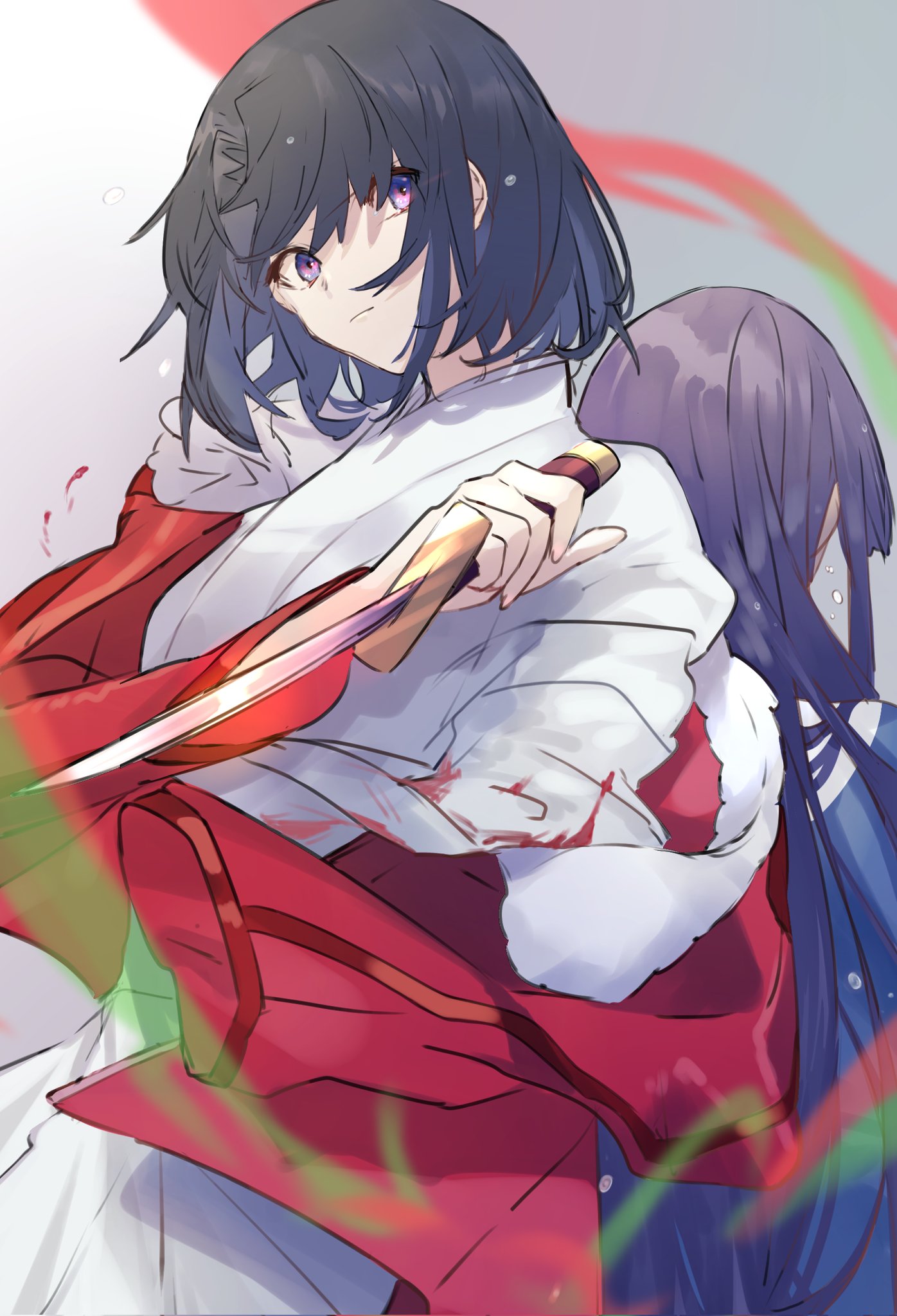 2girls aokurage_1201 asagami_fujino black_hair glowing glowing_eyes highres holding holding_weapon japanese_clothes kara_no_kyoukai kimono knife multiple_girls purple_hair ryougi_shiki weapon white_kimono