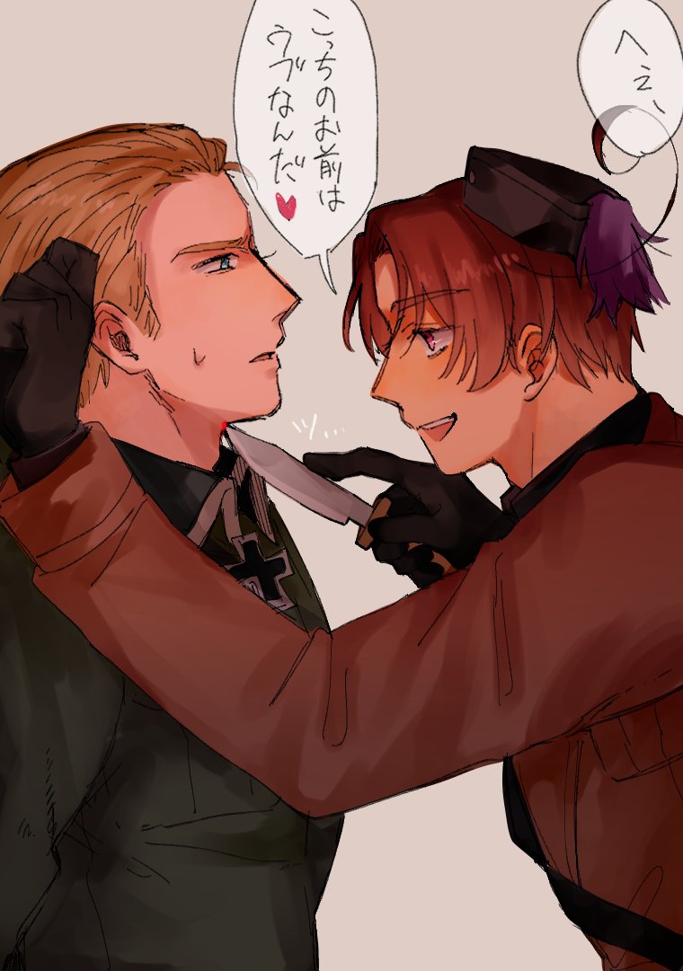 2boys ahoge axis_powers_hetalia belt black_belt black_gloves black_hat blonde_hair blue_eyes breast_pocket brown_hair brown_jacket collared_jacket commentary_request cross dagger germany_(hetalia) gloves green_jacket grey_background hand_up hat heart holding holding_dagger holding_knife holding_weapon iron_cross jacket knife long_sleeves looking_at_another male_focus male_yandere military_jacket mini_hat multiple_boys northern_italy_(hetalia) open_mouth po_te_06 pocket red_eyes short_hair simple_background smile speech_bubble sweatdrop teeth translation_request upper_body weapon yandere yaoi