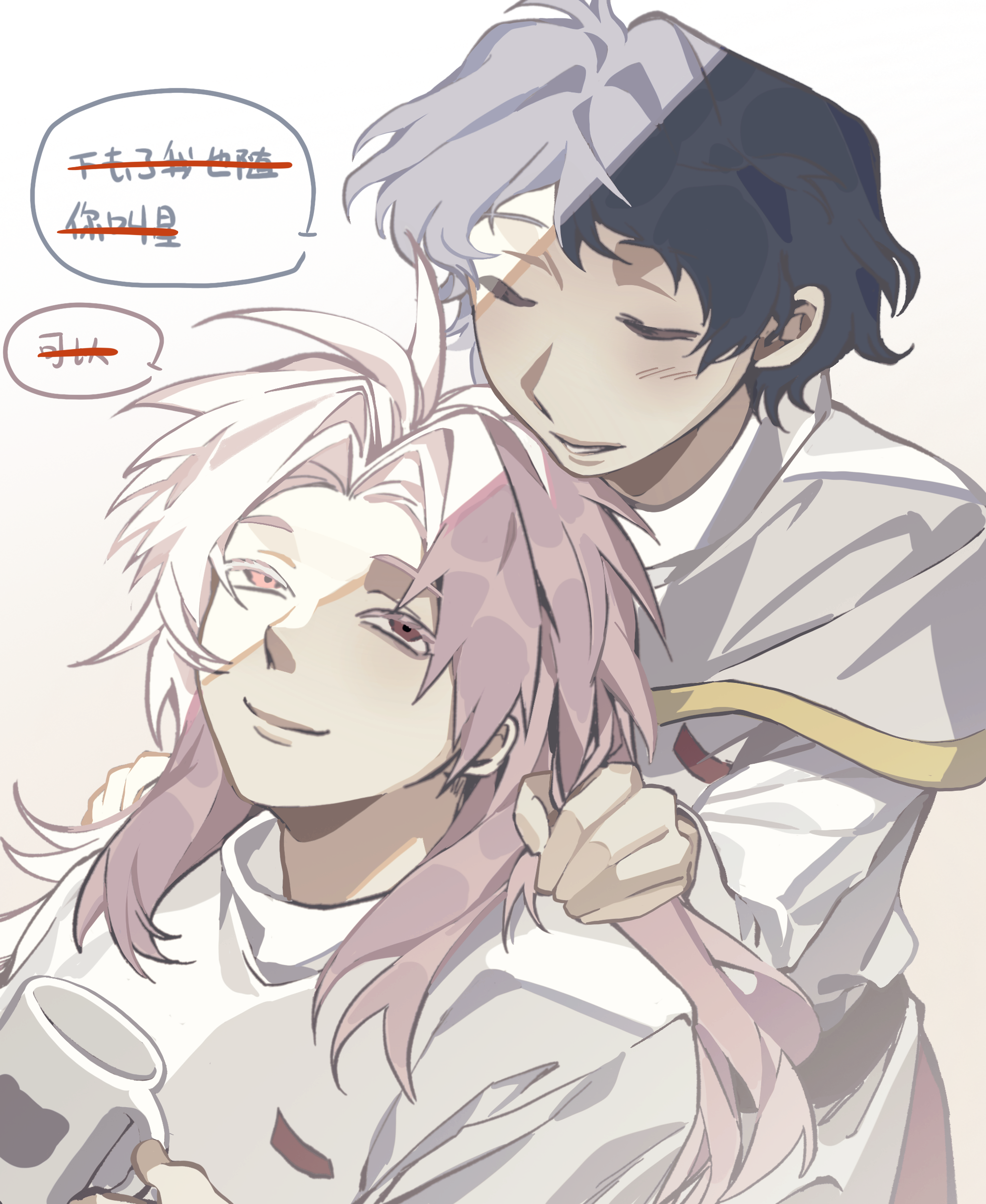 2boys absurdres black_hair capelet chinese_commentary chinese_text chunaizhanshi23057 closed_eyes colored_eyelashes commentary_request cup curtained_hair gold_trim hair_intakes hands_on_another's_shoulders hatsutori_hajime highres holding holding_cup long_hair long_sleeves male_focus mug multiple_boys parted_bangs pink_hair red_eyes saibou_shinkyoku shirt short_hair smile speech_bubble translation_request utsugi_noriyuki variant_set white_background white_capelet white_shirt