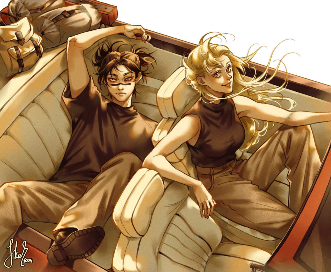 1boy 1girl bag black_hair black_shirt blonde_hair brown_pants car choso_(jujutsu_kaisen) closed_mouth commentary driving english_commentary facial_mark floating_hair jujutsu_kaisen looking_at_viewer motor_vehicle pants parted_lips shirt shoulder_bag skar_1004 sleeveless smile t-shirt tsukumo_yuki_(jujutsu_kaisen) twintails