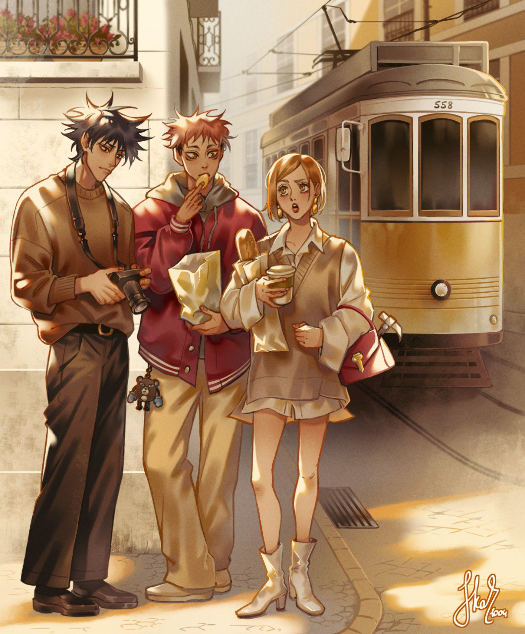 1girl 2boys black_hair bob_cut boots bread brown_hair camera charm_(object) chips_(food) commentary cup earrings eating english_commentary facial_mark food full_body fushiguro_megumi highres holding holding_camera holding_cup hood hoodie itadori_yuji jewelry jujutsu_kaisen kugisaki_nobara multiple_boys outdoors pink_hair potato_chips short_hair signature skar_1004 sweater sweater_vest tsukamoto_(jujutsu_kaisen) white_boots