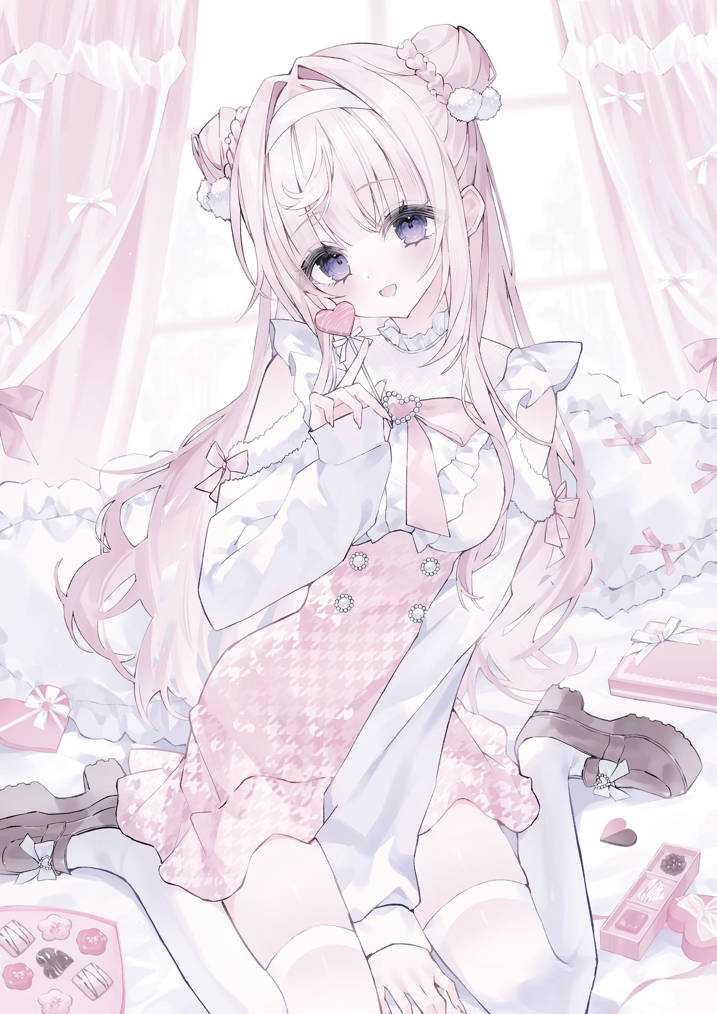 1girl bow bowtie braid breasts brown_shoes bun_with_braided_base candy clothing_cutout curtains food hair_bun hair_intakes hair_ornament hairband head_tilt heart heart-shaped_food heart-shaped_lollipop heart-shaped_pillow high-waist_skirt highres himeno_aimu holding holding_candy holding_food holding_lollipop houndstooth indie_virtual_youtuber indoors lollipop long_hair long_sleeves medium_breasts noah_(0noah) open_mouth pillow pink_bow pink_bowtie pink_hair pink_skirt pink_theme platform_heels pom_pom_(clothes) pom_pom_hair_ornament purple_eyes shaped_lollipop shirt shoes shoulder_cutout sitting skirt sleeve_bow smile tareme thighhighs virtual_youtuber wariza white_hairband white_shirt white_thighhighs window