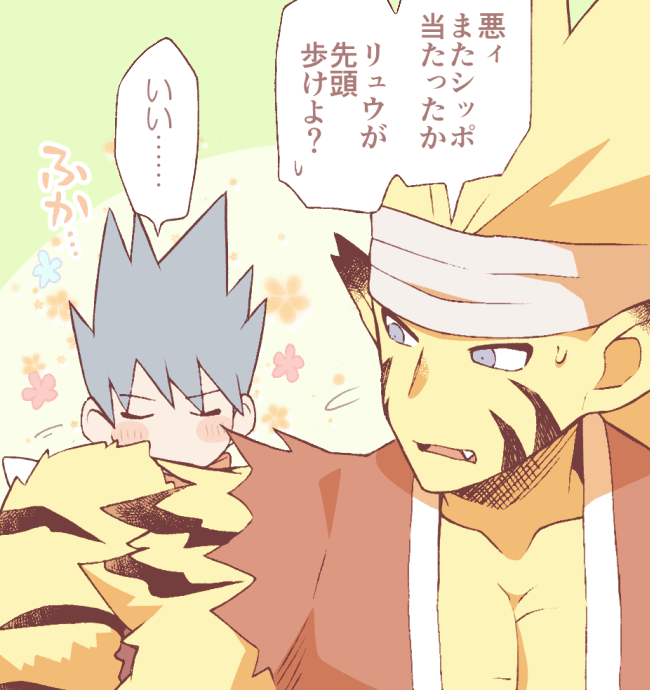 2boys animal_ears blonde_hair blue_eyes blue_hair blush_stickers breath_of_fire breath_of_fire_iii colored_skin facial_mark fang headband long_hair lying male_focus minashirazu multiple_boys open_mouth rei_(breath_of_fire) ryu_(breath_of_fire_iii) sleeveless striped_tail tail yellow_skin