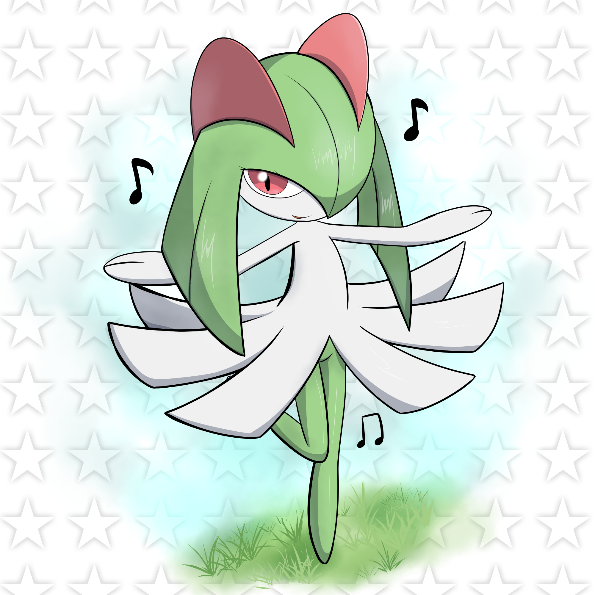 azuma_dai colored_skin gen_3_pokemon grass green_hair green_skin highres horns kirlia looking_at_viewer multicolored_skin musical_note nintendo on_ground pink_eyes pokemon pokemon_(creature) sidelocks smile star_(symbol) star_symbol_background two-tone_skin white_skin