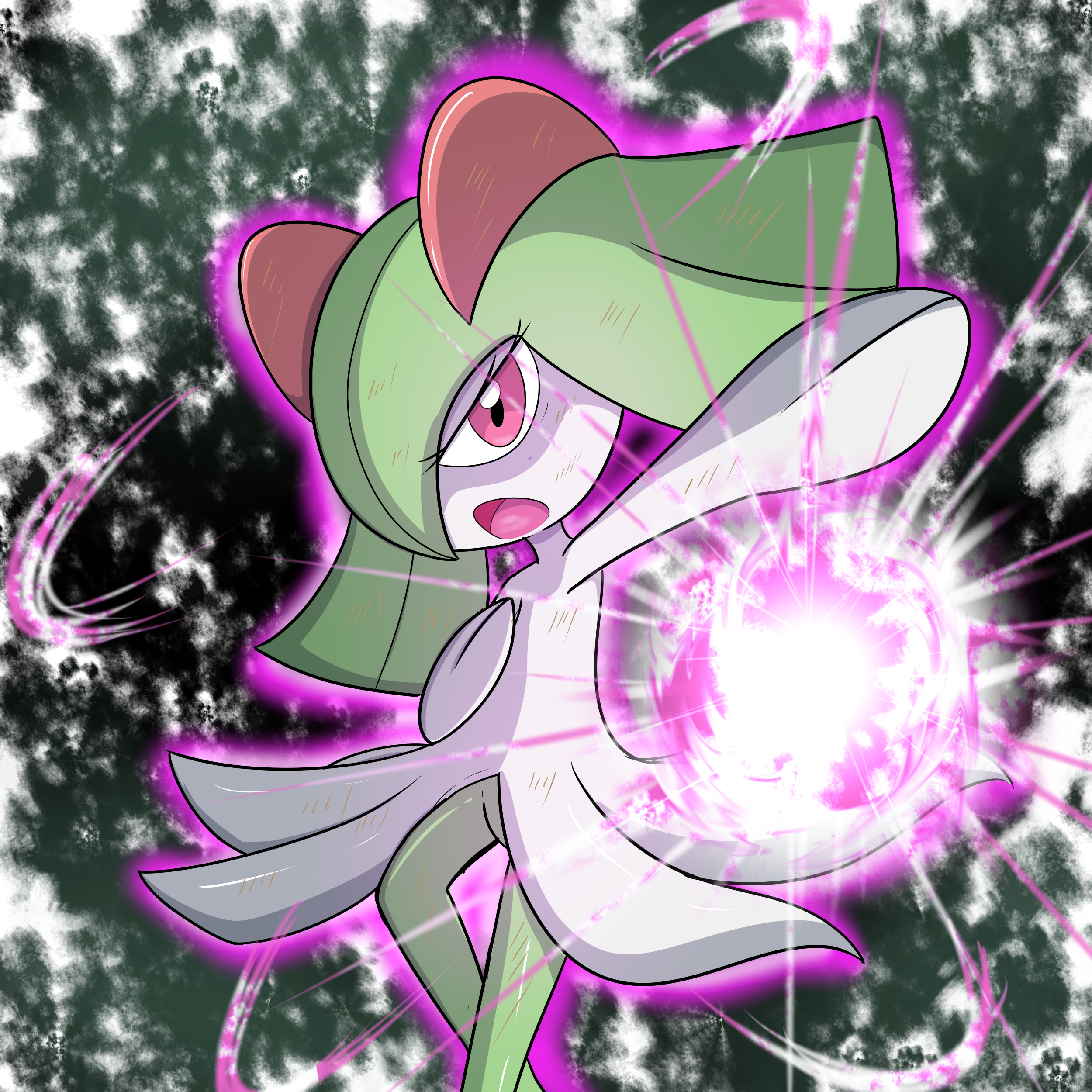 absurdres azuma_dai colored_skin energy_ball gen_3_pokemon glowing green_hair green_skin highres horns kirlia looking_at_viewer multicolored_skin nintendo open_mouth pink_eyes pokemon pokemon_(creature) sidelocks two-tone_skin white_skin