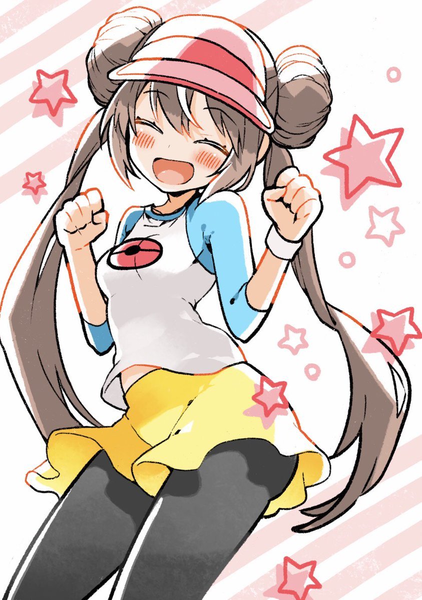 1girl ^_^ black_pantyhose blush breasts brown_hair clenched_hands closed_eyes commentary_request double_bun hair_bun hat highres kashi-k long_hair medium_breasts nintendo open_mouth pantyhose pink_hat poke_ball_print pokemon pokemon_black_2_and_white_2 rosa_(pokemon) shirt shorts simple_background solo star_(symbol) twintails very_long_hair visor_cap yellow_shorts