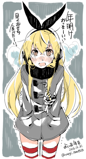 1girl anchor_hair_ornament blonde_hair blush brown_eyes coat cold commentary_request crossed_bangs dated grey_coat hair_between_eyes hair_ornament hands_in_pockets kantai_collection kashi-k long_hair looking_at_viewer open_mouth runny_nose shimakaze_(kancolle) sidelocks simple_background snot solo striped_clothes striped_thighhighs thighhighs translation_request twitter_username