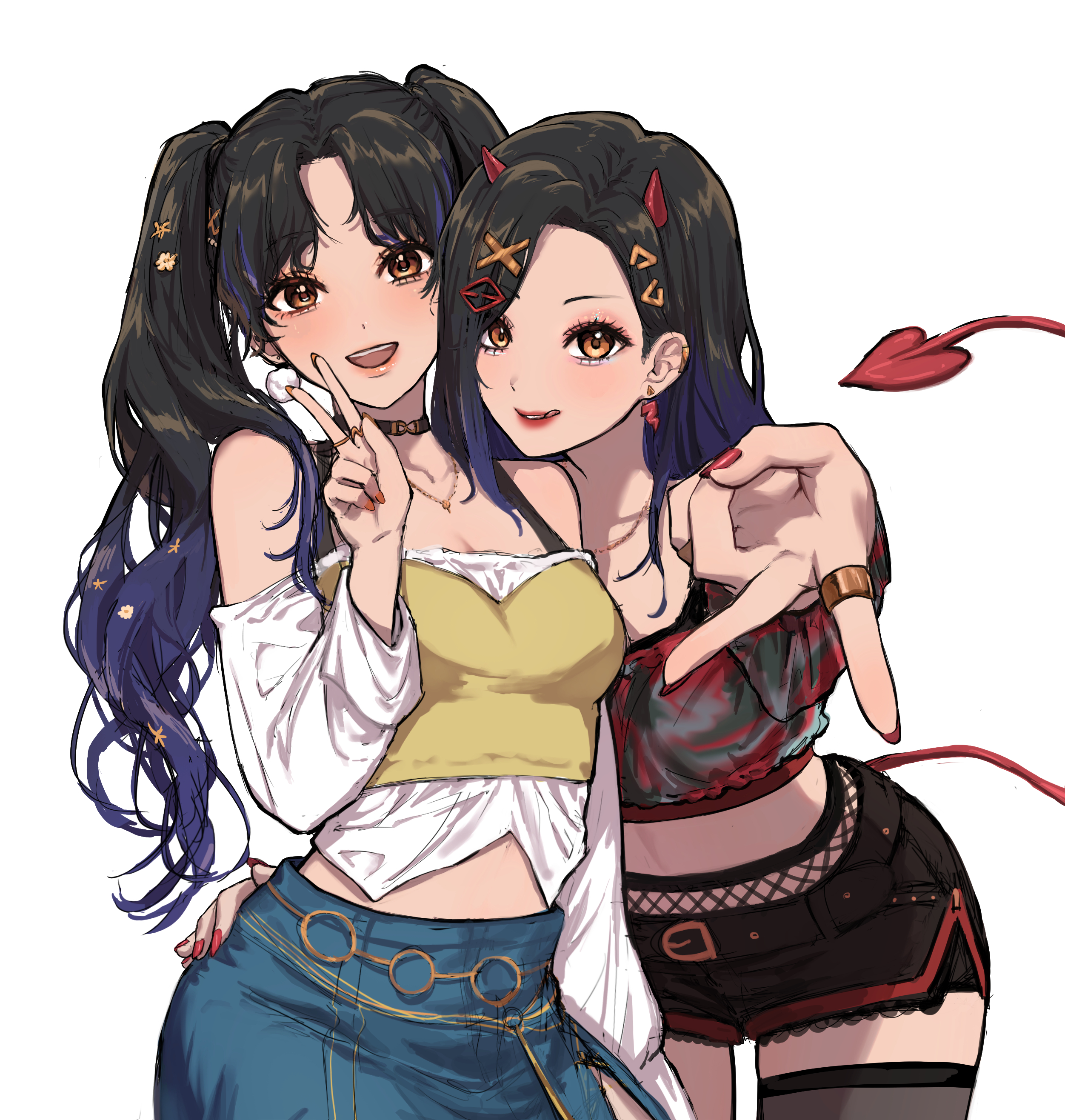 2girls absurdres black_hair black_shorts bloom_festival_(project_sekai) blue_hair blue_skirt breasts cleavage colorful_festival_(project_sekai) commentary crop_top demon_girl demon_horns demon_tail dual_persona earrings flower gradient_hair gyaru_v hair_flower hair_ornament hashtag-only_commentary highres horns jewelry lace-trimmed_shorts lace_trim midriff multicolored_hair multiple_girls myeoneuri official_alternate_hair_length official_alternate_hairstyle open_mouth orange_eyes parted_bangs pom_pom_(clothes) pom_pom_earrings project_sekai red_nails ring shiraishi_an shorts sidelocks simple_background skirt smile star_(symbol) star_hair_ornament untranslatable_commentary tail tongue tongue_out twintails v white_background