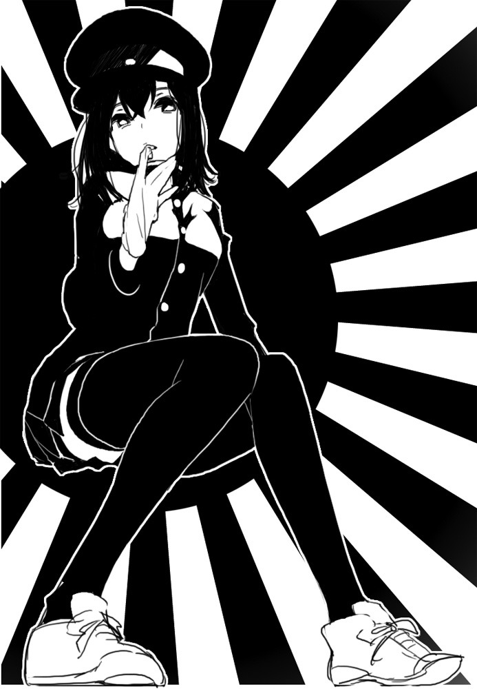 1girl akitsu_maru_(kancolle) breasts glove_in_mouth glove_pull gloves greyscale hair_between_eyes hat jacket kantai_collection kashi-k long_hair long_sleeves medium_hair military_uniform monochrome mouth_hold peaked_cap pleated_skirt rising_sun_flag shoes sitting skirt solo sunburst thighhighs