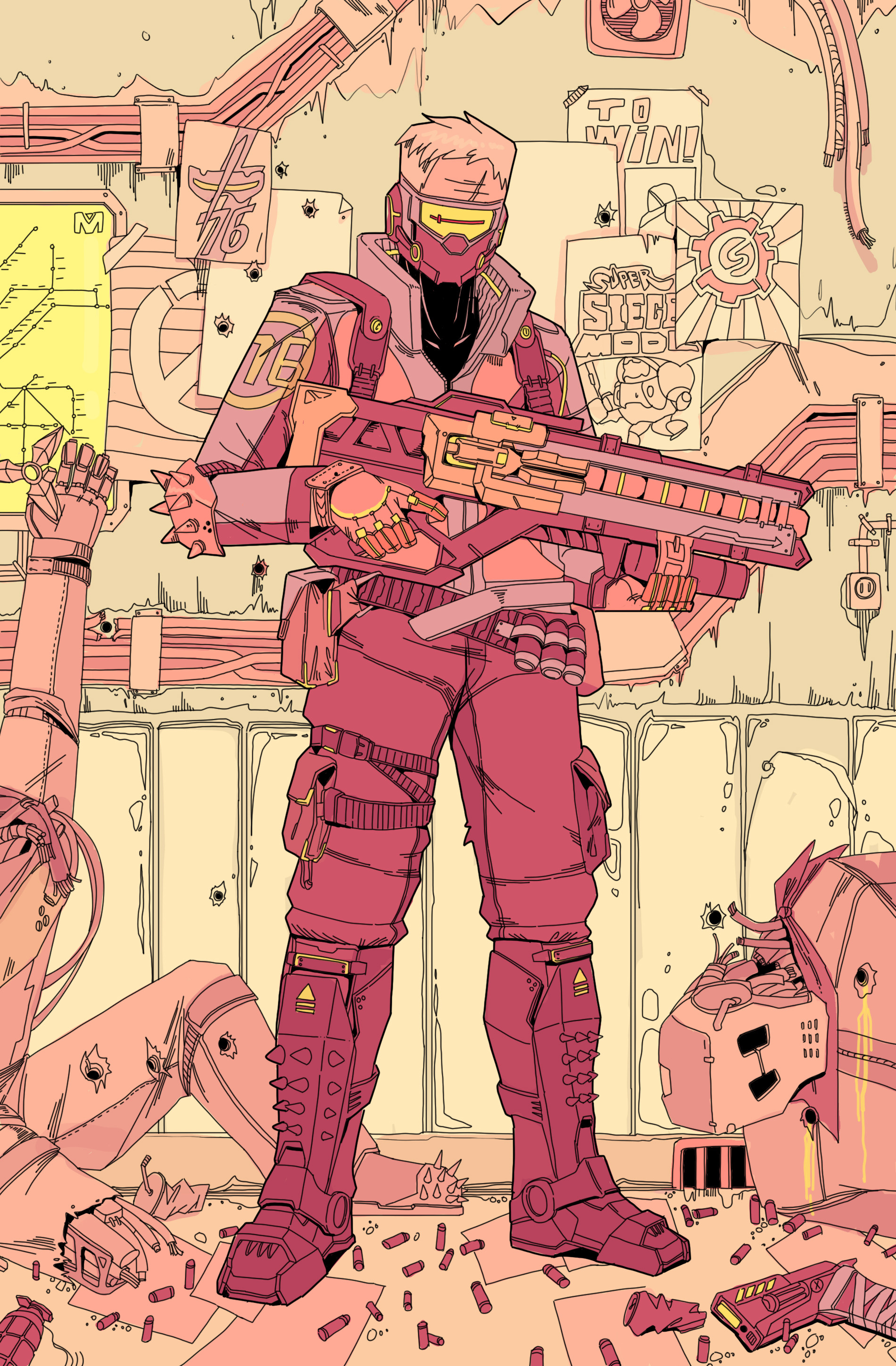 1boy absurdres armored_boots assault_rifle belt boots bullet_hole cable can cup cyborg disposable_cup drink_can elbow_pads english_text explosive finger_on_trigger full_body gloves grenade gun handgun high_collar highres holding holding_gun holding_weapon humanoid_robot indoors iwse_zhang jacket long_sleeves male_focus old old_man overwatch paper pocket poster_(object) pouch rifle robot scar scar_on_face shell_casing short_hair shuriken soldier:_76_(overwatch) solo spikes standing thigh_pouch two-handed weapon yellow_background