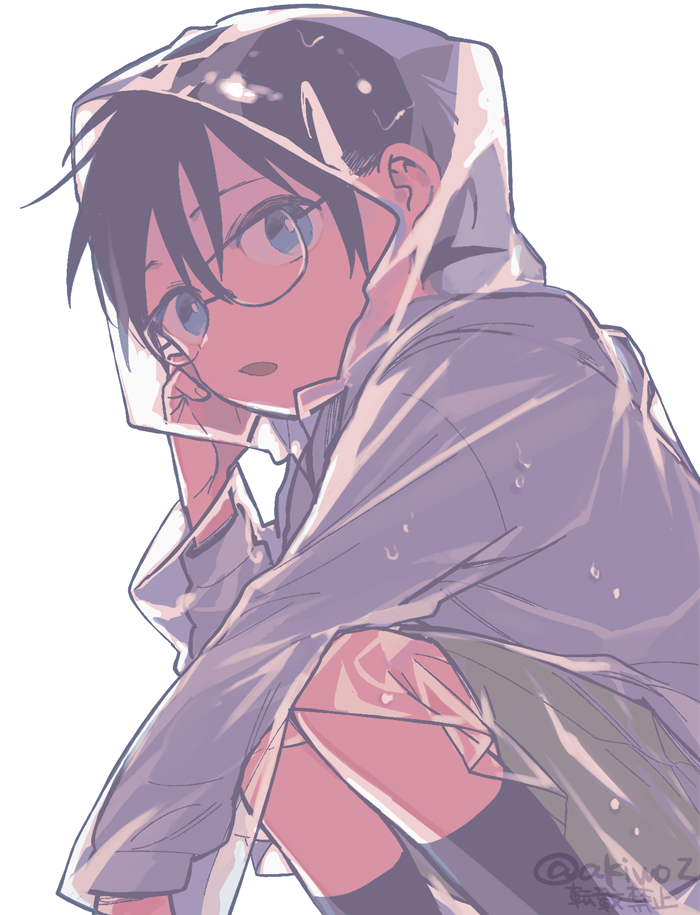 1boy akio_(89e) arm_on_knee arm_up black_hair black_socks blue_eyes edogawa_conan feet_out_of_frame from_side glasses green_shorts hair_between_eyes hood hood_up kneeling long_sleeves male_focus meitantei_conan open_mouth raincoat rimless_eyewear see-through_clothes see-through_raincoat shirt short_hair shorts simple_background socks twitter_username white_background white_shirt