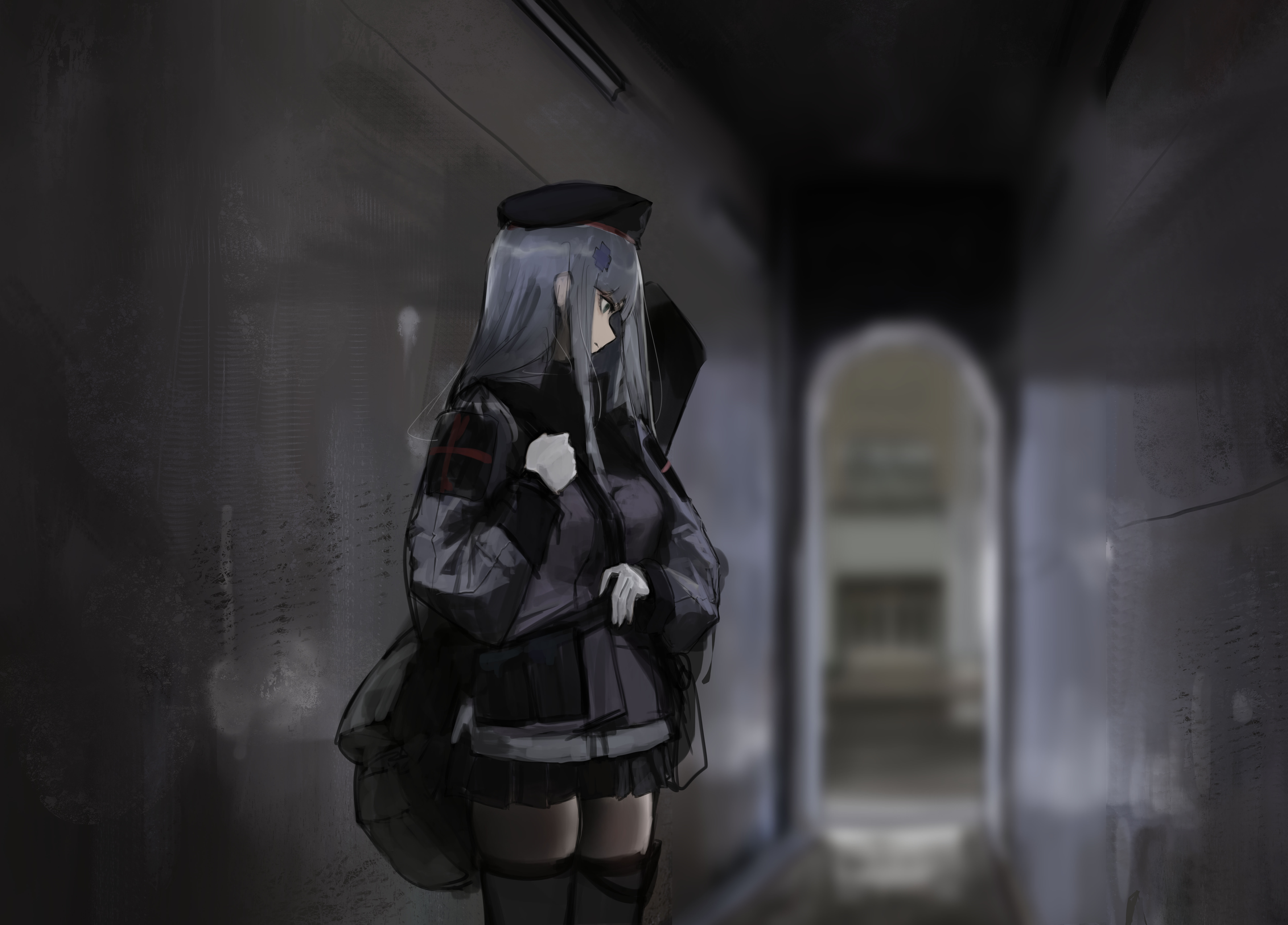 1girl absurdres beret blue_hair blurry blurry_background girls'_frontline gloves grey_thighhighs hat highres hk416_(girls'_frontline) jacket looking_to_the_side lsha pleated_skirt skirt solo thighhighs thighs weapon_case white_gloves