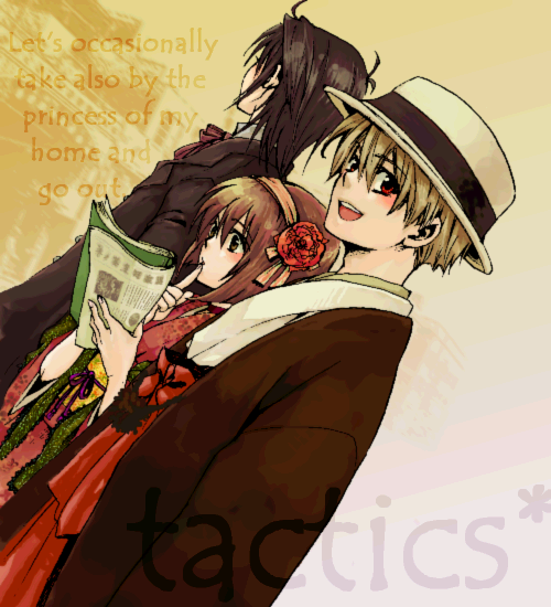1girl 2boys adam's_apple alternate_costume black_hair bob_cut brown_eyes brown_hair brown_haori copyright_name dutch_angle english_text facing_away finger_to_mouth flower formal_clothes hair_flower hair_ornament hairband hakama haori haruka_(tactics) hat height_difference holding ichinomiya_kantarou japanese_clothes kimono multiple_boys open_mouth reading red_eyes red_flower red_hakama red_kimono smile suit tactics youko_(tactics) yuki_(hello_idiot)