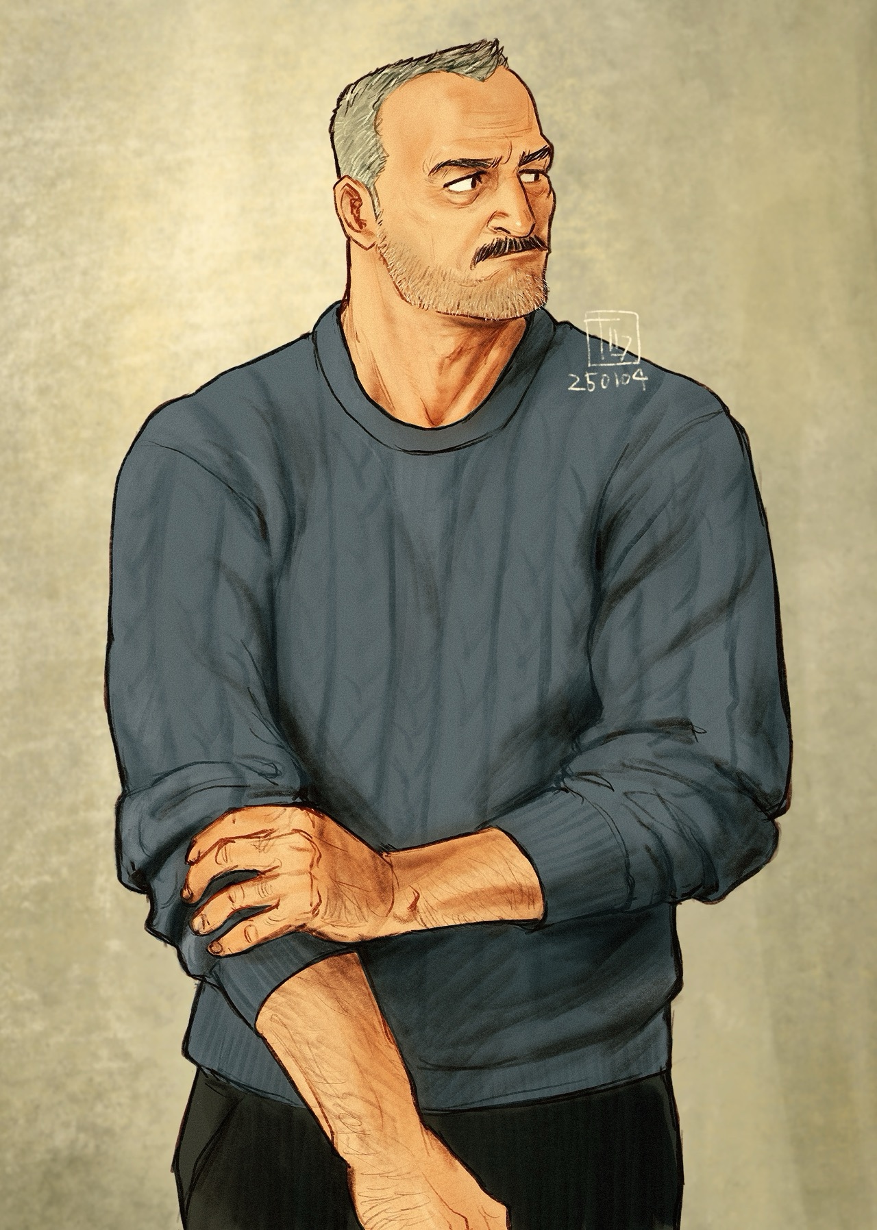 1boy 2025 aaron_gruber_(o_natsuo88) black_pants blue_sweater dated facial_hair grey_hair hand_on_own_arm highres long_sleeves looking_to_the_side male_focus mature_male mustache o_natsuo88 original pants short_hair sleeves_rolled_up stubble sweater very_short_hair