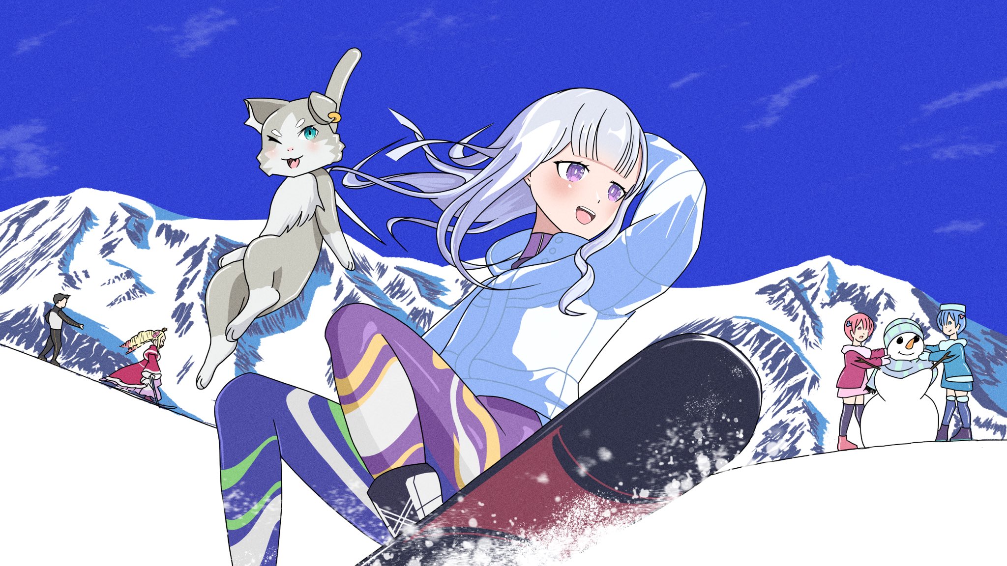 2boys 4girls beatrice_(re:zero) black_hair blonde_hair blue_hair dress emilia_(re:zero) highres mountain multiple_boys multiple_girls natsuki_subaru pants pink_dress pink_eyes puck_(re:zero) purple_eyes ram_(re:zero) re:zero_kara_hajimeru_isekai_seikatsu rem_(re:zero) scarf siblings sisters snow snowboard snowman sweater thwoops white_hair winter winter_clothes yoga_pants