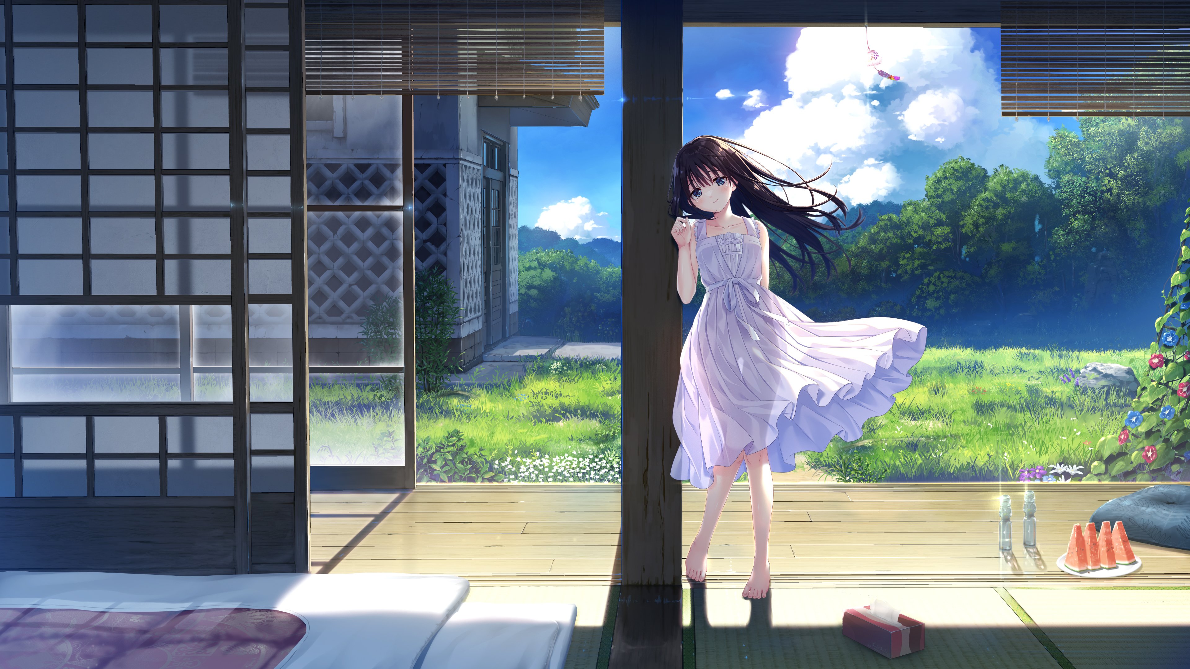1girl absurdres barefoot black_hair blue_eyes blue_sky cloud commentary_request courreges_ace cumulonimbus_cloud dress ecchi_de_ichizuna_do_inaka-kei-sama_to_koshiki_yukashii_byoujaku_imouto food fruit full_body grass highres long_hair looking_at_viewer official_art shade sky sliding_doors smile solo standing summer sunlight tatami watermelon watermelon_slice white_dress wind_chime