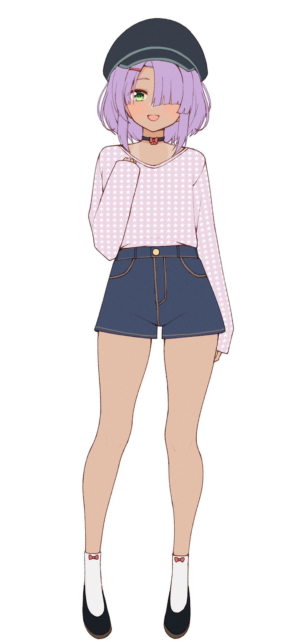 1girl :d alternate_costume arm_at_side black_choker black_hat black_shoes blunt_ends blush bow bowtie cafe_stella_to_shinigami_no_chou casual choker commentary dark-skinned_female dark_skin denim denim_shorts full_body green_eyes hair_ornament hair_over_one_eye hairclip hand_up happy hat highres hiuchidani_mei long_bangs looking_at_viewer one_eye_covered open_mouth peaked_cap pink_shirt print_shirt purple_hair red_bow red_bowtie shirt shoes short_hair shorts simple_background sleeves_past_wrists smile socks solo standing star_(symbol) star_print tachi-e tan tanline tft_(tft7822) white_background white_socks