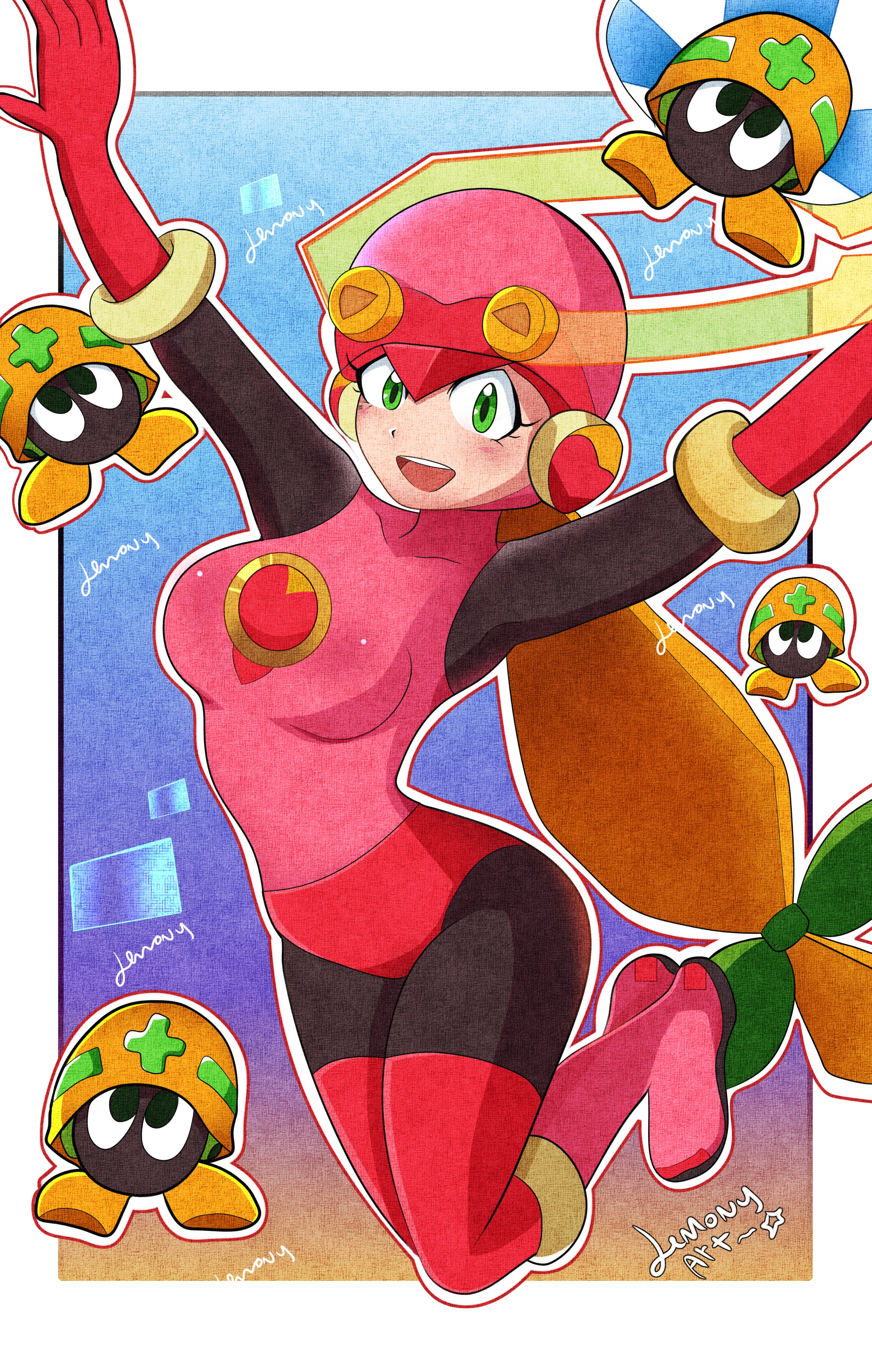 1girl absurdres artist_name artlemony black_bodysuit blonde_hair blue_background bodysuit green_eyes helmet highres leotard long_hair mega_man_(series) mega_man_battle_network_(series) met_(mega_man) pink_helmet pink_leotard roll.exe_(mega_man) simple_background smile solo_focus