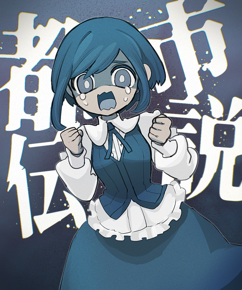 1girl blue_theme clenched_hands commentary_request crying crying_with_eyes_open frilled_shirt frills fukurai_azami mikeli_li_(artist) open_mouth shirt short_hair skirt solo tears toshi_densetsu_kaitai_center translation_request
