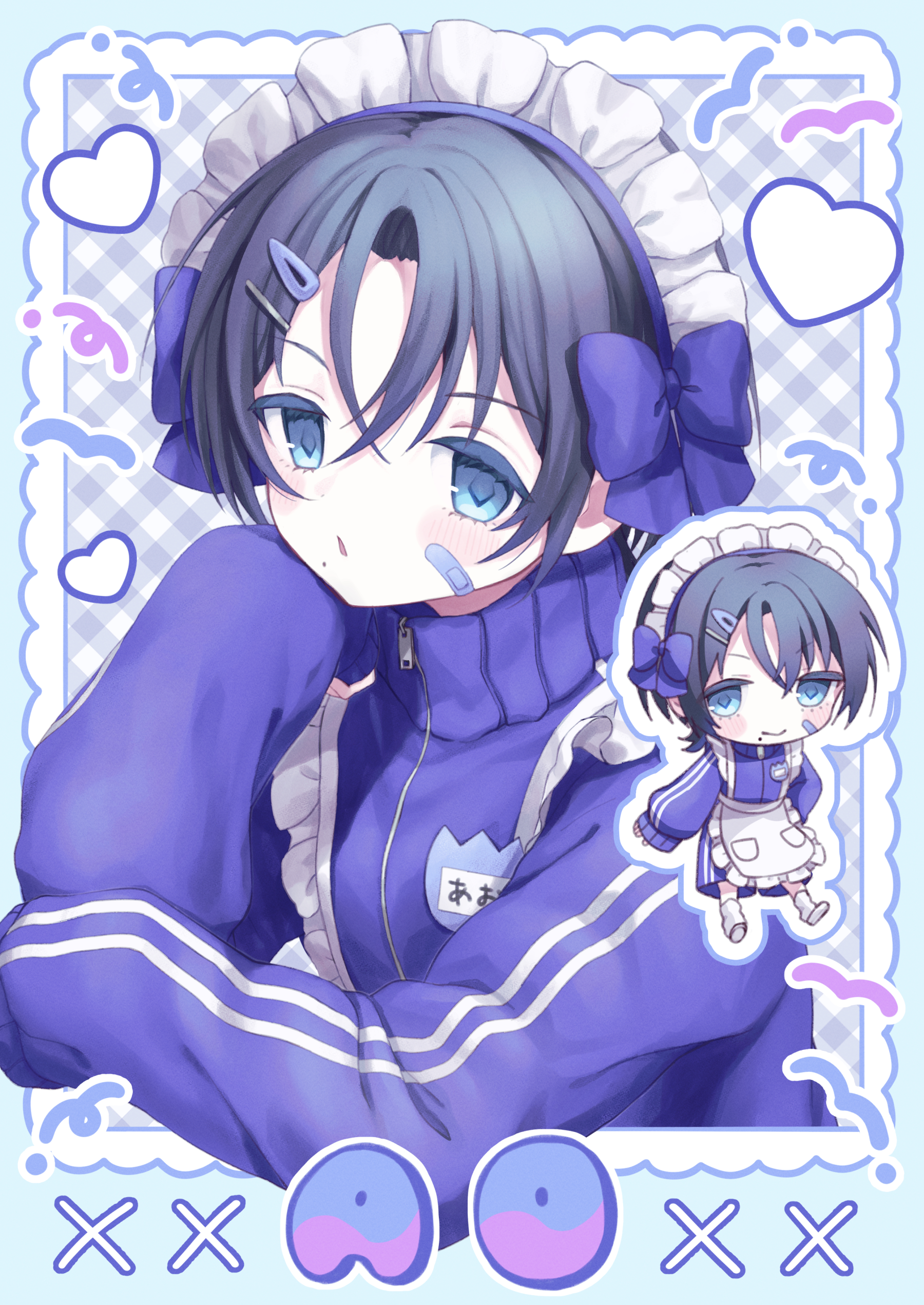 1girl absurdres alternate_costume apron bandaid bandaid_on_face black_hair blue_eyes blue_jacket chibi chibi_inset enmaided heart highres hiodoshi_ao hololive hololive_dev_is jacket looking_at_viewer maid maid_apron maid_headdress medium_hair nuinuniki virtual_youtuber zipper_pull_tab