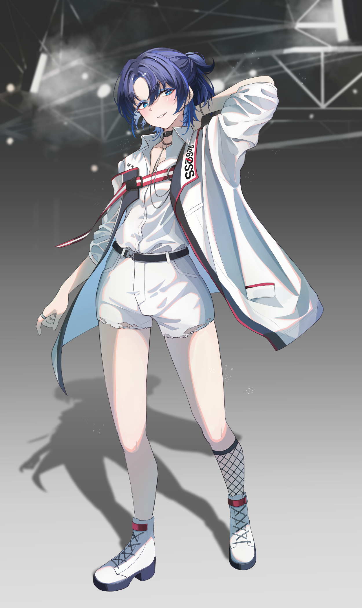 1girl arm_up black_choker blue_eyes blue_eyeshadow blue_hair choker eyeshadow fishnet_socks fishnets full_body highres hiodoshi_ao hiodoshi_ao_(regloss_uniform) hololive hololive_dev_is jacket makeup ponytail schneid0124 shadow shirt shoes shorts socks solo standing virtual_youtuber white_jacket white_shirt white_shoes white_shorts