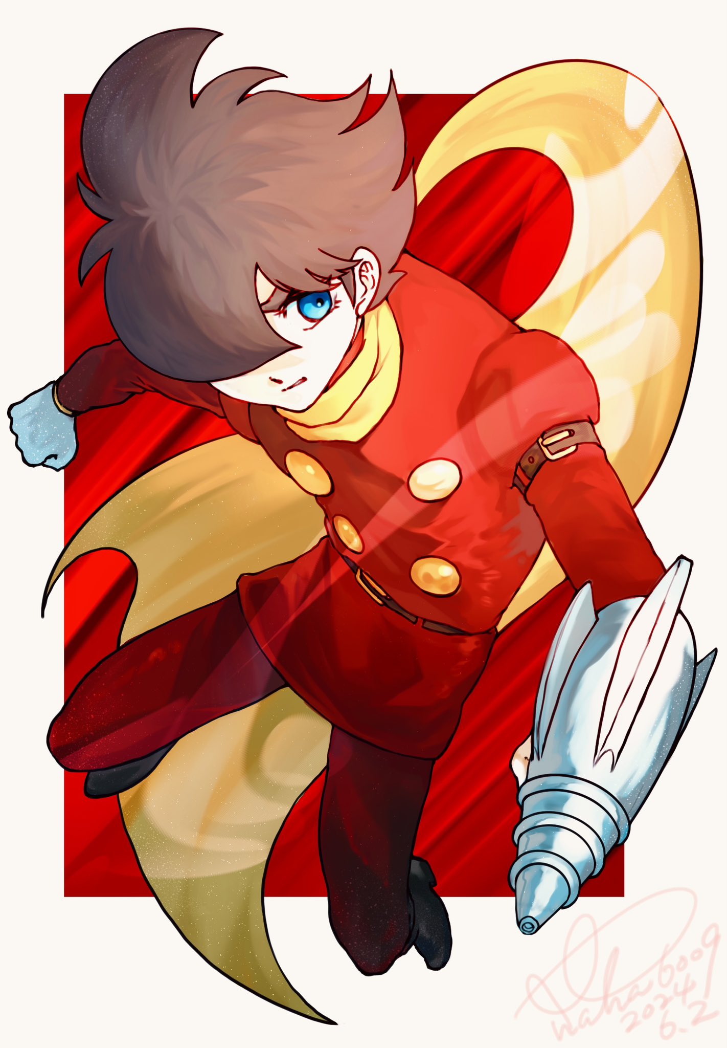 1boy belt black_boots blue_eyes boots brown_hair buttons coat cyborg cyborg_009 dynamic_pose full_body hair_over_one_eye highres holding holding_weapon looking_to_the_side military_uniform red_coat scarf shimamura_joe short_hair soldier weapon yanaka_6009 yellow_scarf