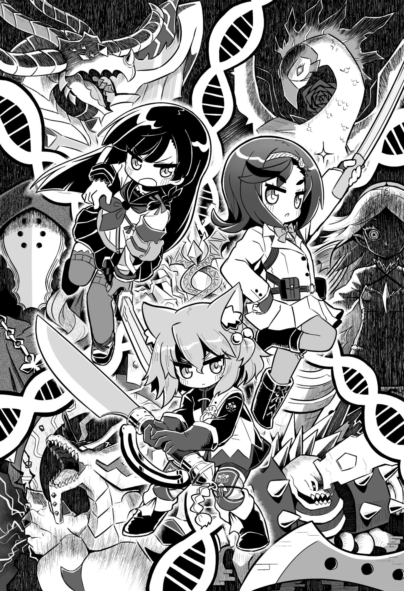 3girls 7th_dragon_(series) animal_ear_fluff animal_ears belt_buckle boots buckle character_request closed_mouth commentary_request gloves greyscale hair_ornament highres holding holding_sword holding_weapon jacket long_sleeves monochrome monster multiple_girls naga_u one_side_up pleated_skirt skirt sword thighhighs thighhighs_under_boots v-shaped_eyebrows weapon