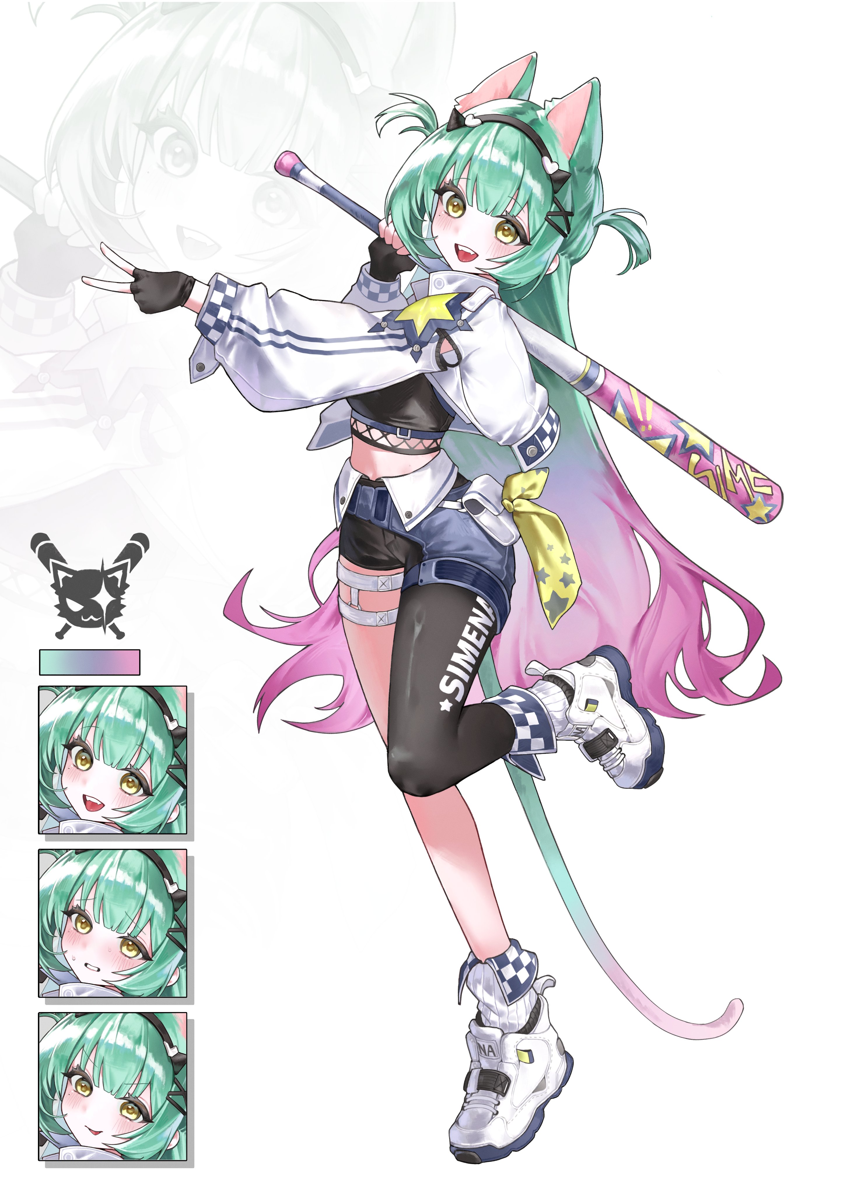 1girl absurdres animal_ears asymmetrical_legwear asymmetrical_shorts baseball_bat black_gloves black_hairband black_ribbon blush cat_ears cat_tail commentary extra_ears fingerless_gloves gloves gradient_hair gradient_tail green_hair hair_ornament hairband hairclip highres holding holding_baseball_bat k1my0 leg_up long_hair looking_at_viewer midriff mismatched_legwear multicolored_hair multiple_expressions open_mouth original pink_hair pouch ribbon shoes single_leg_pantyhose sneakers solo tail teeth unworn_hair_ornament unworn_hairclip upper_teeth_only v very_long_hair white_shoes yellow_eyes