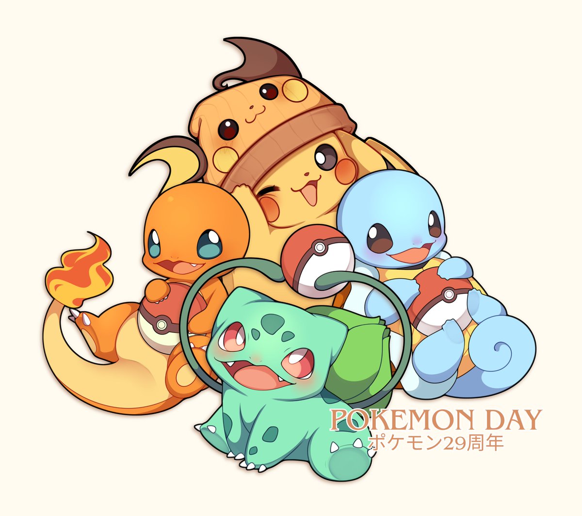:d ;d black_eyes blush_stickers brown_background bulbasaur character_hat charmander commentary english_commentary fang fangs fire flame-tipped_tail gen_1_pokemon holding holding_poke_ball looking_at_viewer nintendo no_humans one_eye_closed open_mouth pikachu poke_ball pokemon pokemon_(creature) pokemon_day raichu red_eyes sevi_(seviyummy) smile squirtle tail
