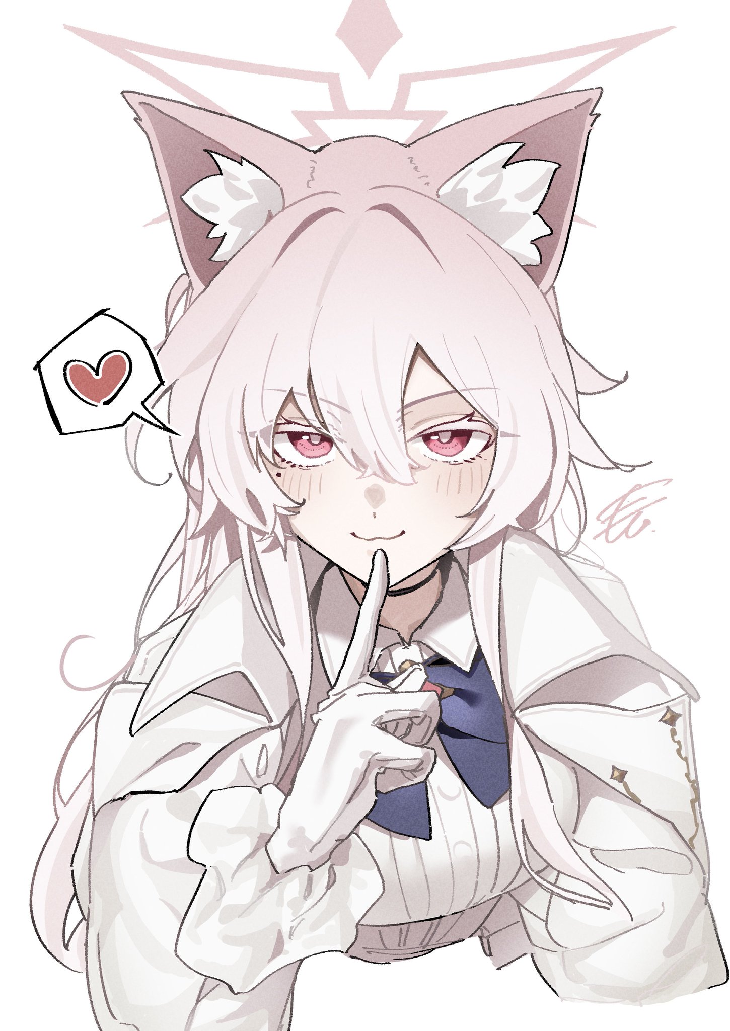 1girl akira_(blue_archive) animal_ear_fluff animal_ears black_choker blue_archive blue_bow blue_bowtie blush bow bowtie cat_ears cat_girl choker closed_mouth coat finger_to_mouth gloves hair_between_eyes heart highres long_hair looking_at_viewer mole mole_under_eye pink_eyes shirt shushing sidelocks smile takinohamira upper_body white_coat white_gloves white_hair white_shirt
