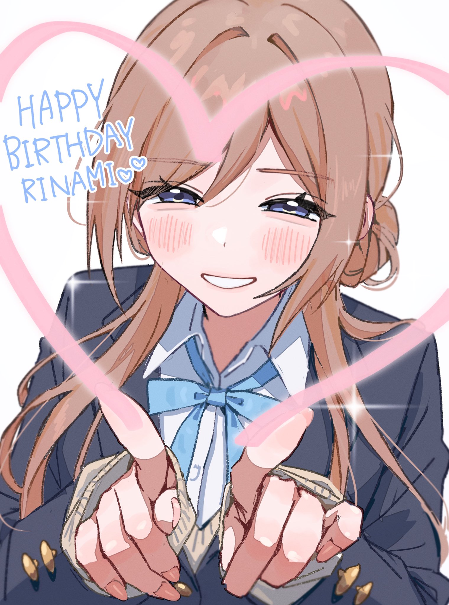 1girl blazer blue_eyes blue_jacket blue_ribbon blush brown_hair brown_sweater character_name collared_shirt commentary drawing_on_fourth_wall drawn_heart english_commentary finger_painting fingernails gakuen_idolmaster hair_between_eyes hair_bun half-closed_eyes hamafugu happy_birthday hatsuboshi_gakuen_school_uniform highres himesaki_rinami idolmaster jacket layered_sleeves long_fingernails long_hair looking_at_viewer mixed-language_commentary neck_ribbon parted_bangs ribbon school_uniform shirt sidelocks simple_background single_side_bun smile solo sparkle sweater upper_body white_background white_shirt