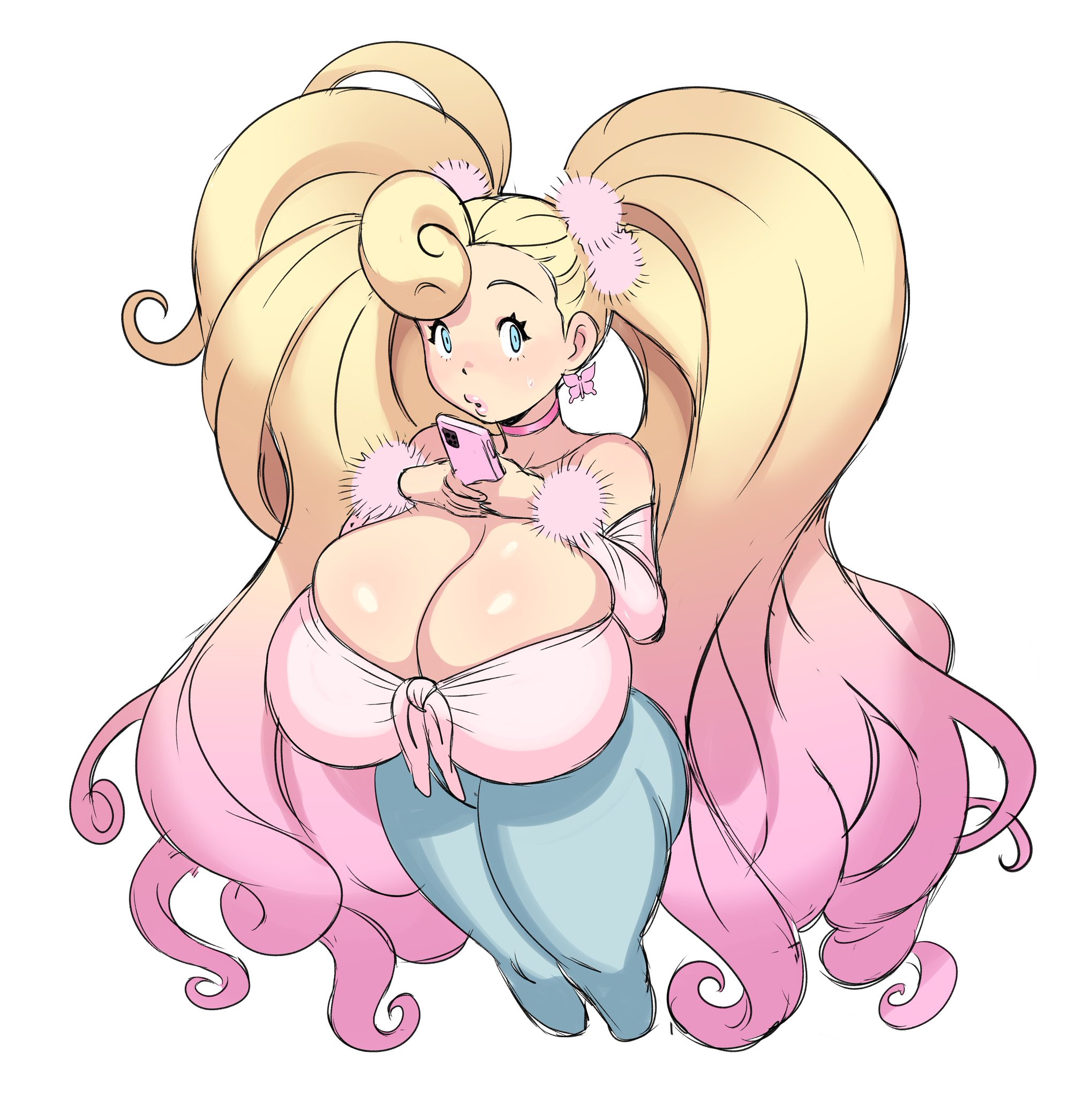 absurdly_long_hair ass blonde_hair blue_eyes breasts cellphone curvy gandg glitter_and_gold highres honey_luxmoore_(gandg) huge_ass huge_breasts large_breasts long_hair multicolored_hair original phone pink_lips smartphone twintails two-tone_hair very_long_hair