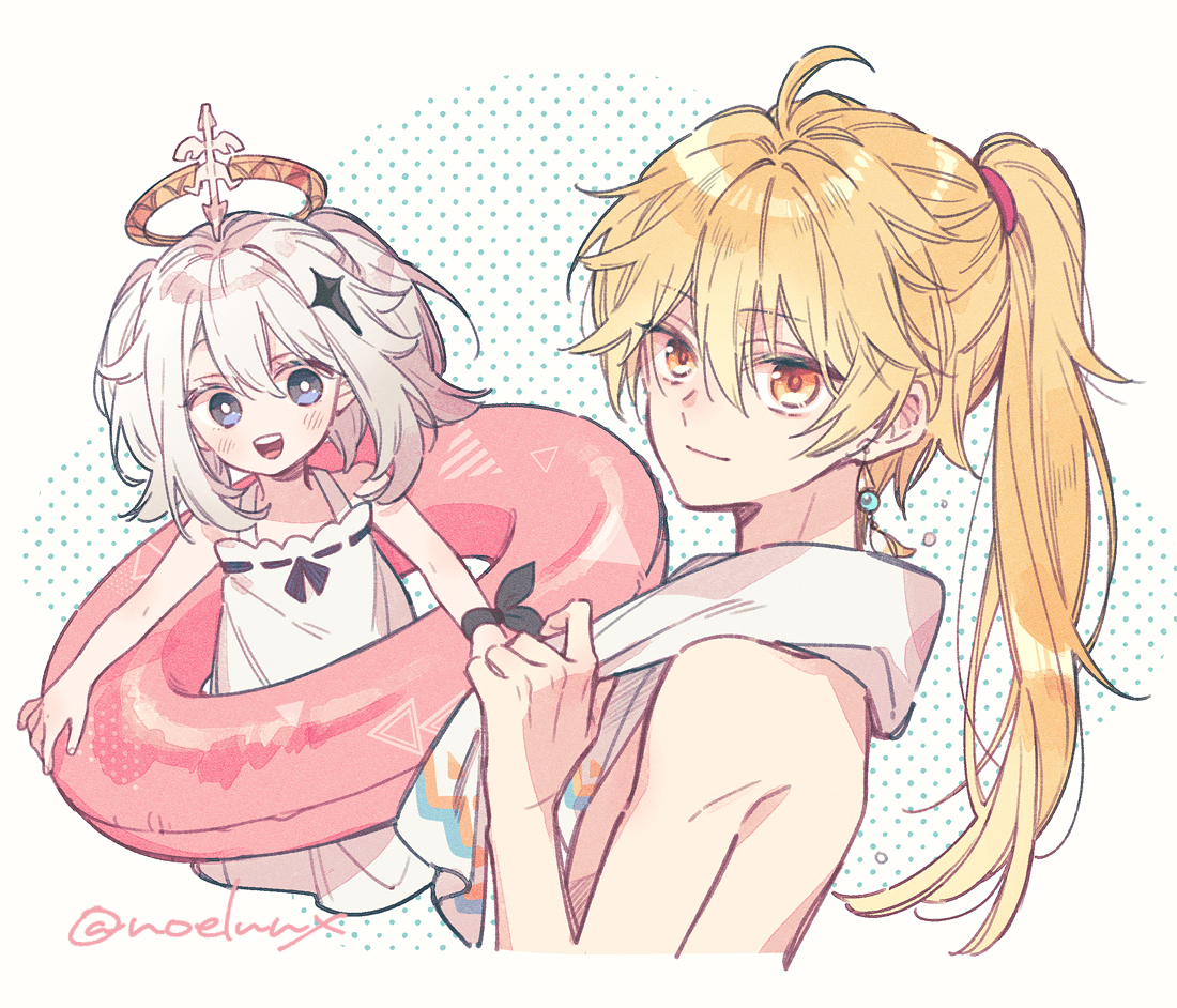 1boy 1girl aether_(genshin_impact) aether_(hot_springs)_(genshin_impact) ahoge artist_name bare_shoulders black_necktie blonde_hair blue_eyes blush border closed_mouth commentary crystal_hair_ornament dress earrings from_side genshin_impact hair_between_eyes hair_ornament halo hand_up high_ponytail innertube jewelry long_hair looking_at_viewer mechanical_halo necktie noelnnx official_alternate_costume official_alternate_hairstyle open_mouth outside_border paimon_(genshin_impact) paimon_(hot_springs)_(genshin_impact) polka_dot polka_dot_background ponytail short_hair single_earring sleeveless sleeveless_dress smile swim_ring untranslatable_commentary teeth towel towel_around_neck twintails upper_body white_background white_border white_dress white_hair yellow_eyes