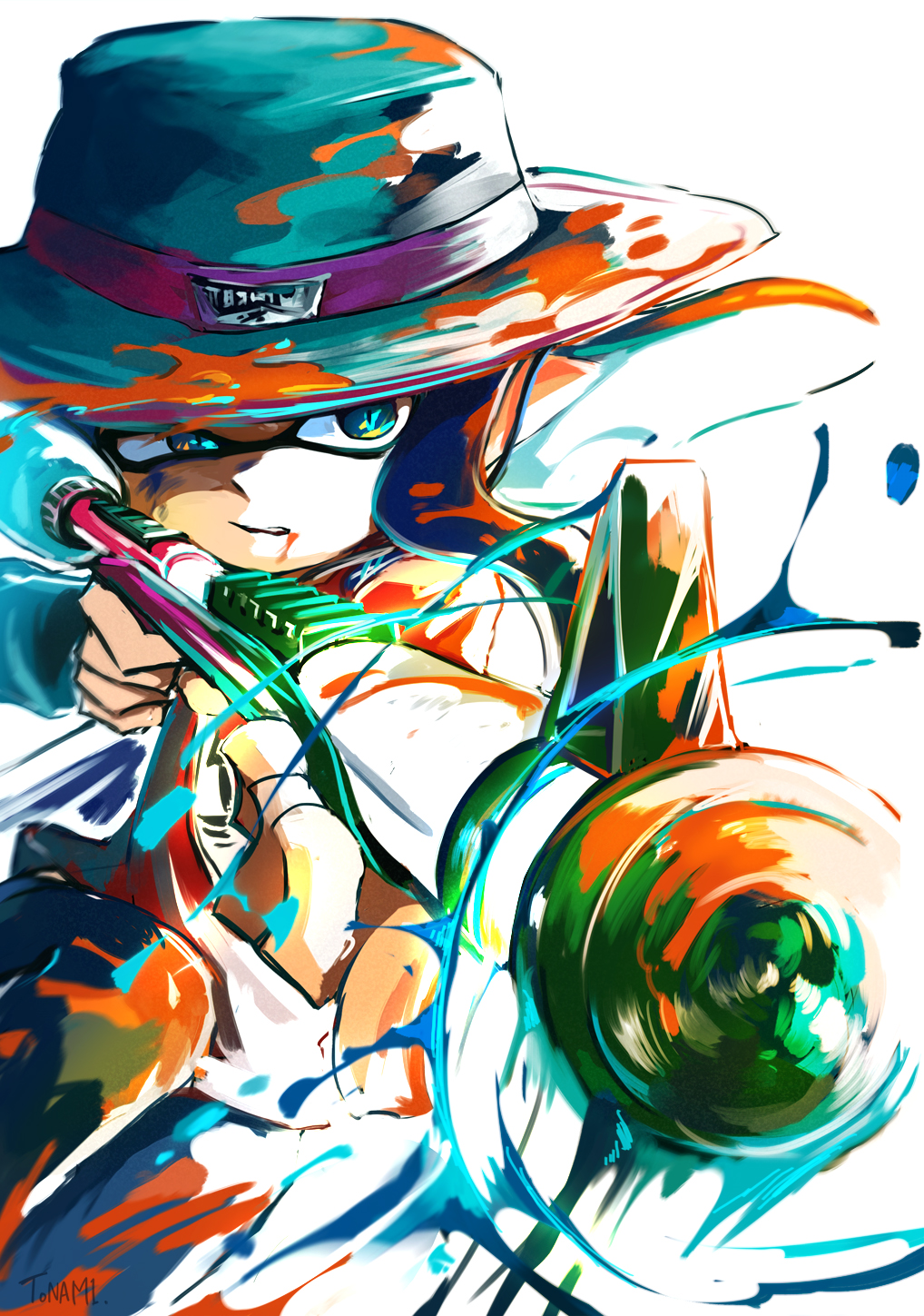 1girl aiming aiming_at_viewer aqua_hat artist_name blue_eyes blue_hair blue_pants commentary_request hat hat_ribbon highres holding holding_weapon inkling inkling_girl inkling_player_character long_hair nintendo paint_splatter paint_splatter_on_face pants parted_lips pointy_ears purple_ribbon red_shirt ribbon shirt solo splat_charger_(splatoon) splatoon_(series) tentacle_hair tona_bnkz weapon white_background