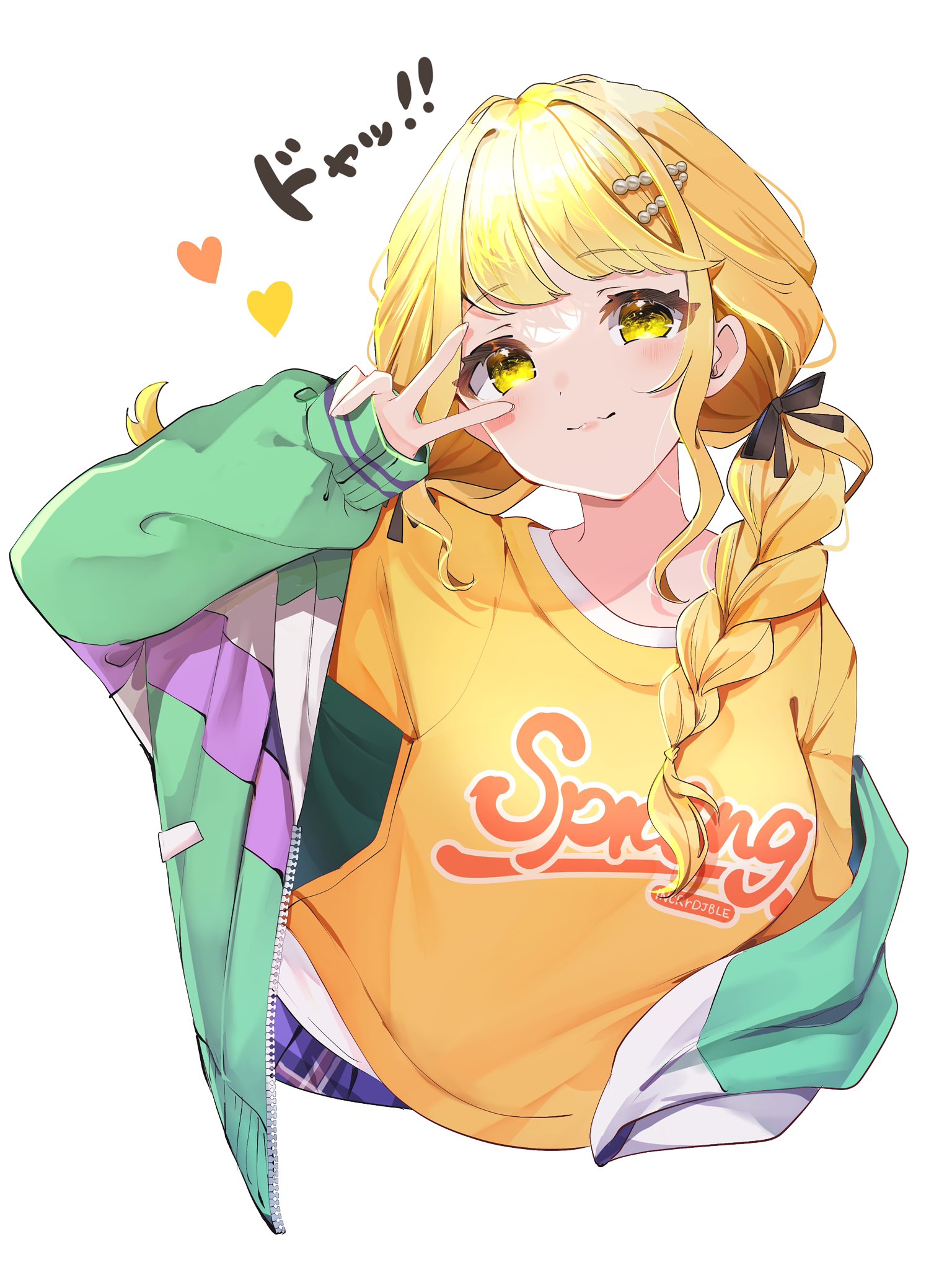 1girl black_ribbon blonde_hair blush braid breasts cropped_legs fujita_kotone gakuen_idolmaster hair_ribbon heart highres idolmaster jacket light_smile long_hair looking_at_viewer medium_breasts multicolored_jacket ribbon shirt simple_background solo twin_braids upper_body v v_over_eye white_background yellow_eyes yellow_shirt yuanagae
