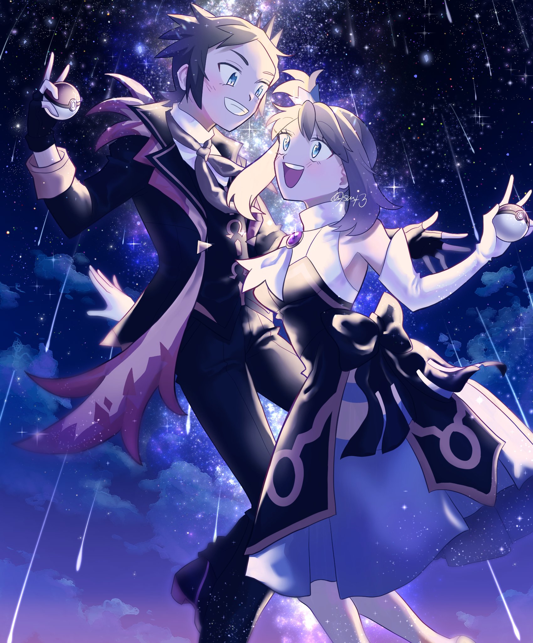 1boy 1girl black_gloves blush brendan_(champion)_(pokemon) brendan_(pokemon) brown_hair elbow_gloves fingerless_gloves gloves highres holding holding_poke_ball looking_at_another may_(champion)_(pokemon) may_(pokemon) night nintendo official_alternate_costume open_mouth poke_ball poke_ball_(basic) pokemon pokemon_masters_ex sanno_(snn_3) shooting_star signature sky sparkle star_(sky) white_gloves