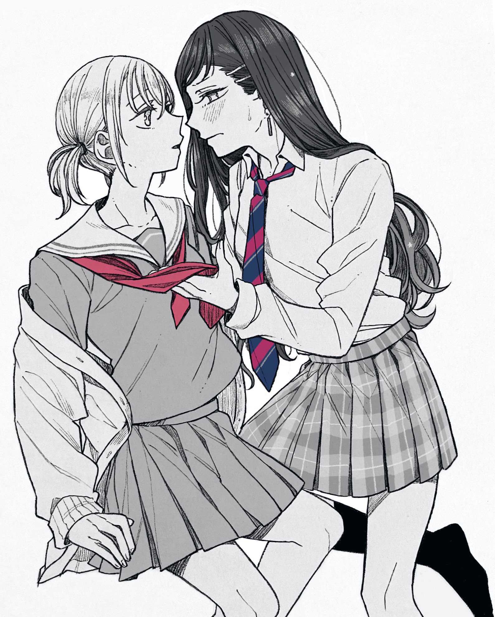 2girls azusawa_kohane blush closed_mouth collared_shirt commentary earrings eye_contact greyscale highres jewelry kneehighs long_hair long_sleeves looking_at_another monochrome multiple_girls mygod55555 neckerchief necktie parted_lips plaid_clothes plaid_skirt pleated_skirt project_sekai red_neckerchief sailor_collar school_uniform serafuku shiraishi_an shirt skirt socks spot_color striped_clothes striped_necktie sweatdrop untranslatable_commentary twintails yuri