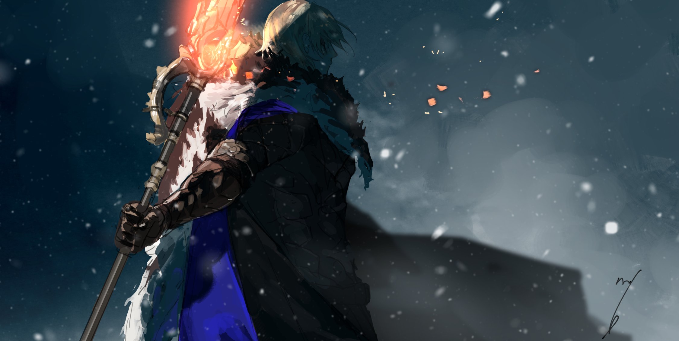 1boy areadbhar_(fire_emblem) arm_up armor black_armor black_fur blonde_hair blue_cape cape cloud cloudy_sky commentary_request cowboy_shot dimitri_alexandre_blaiddyd dimitri_alexandre_blaiddyd_(timeskip) fire fire_emblem fire_emblem:_three_houses floating_hair fur-trimmed_cape fur_trim hair_over_eyes highres holding holding_polearm holding_weapon male_focus matoba_(ga6life) nintendo ornate_weapon outstretched_arm polearm sky snowing solo weapon white_fur
